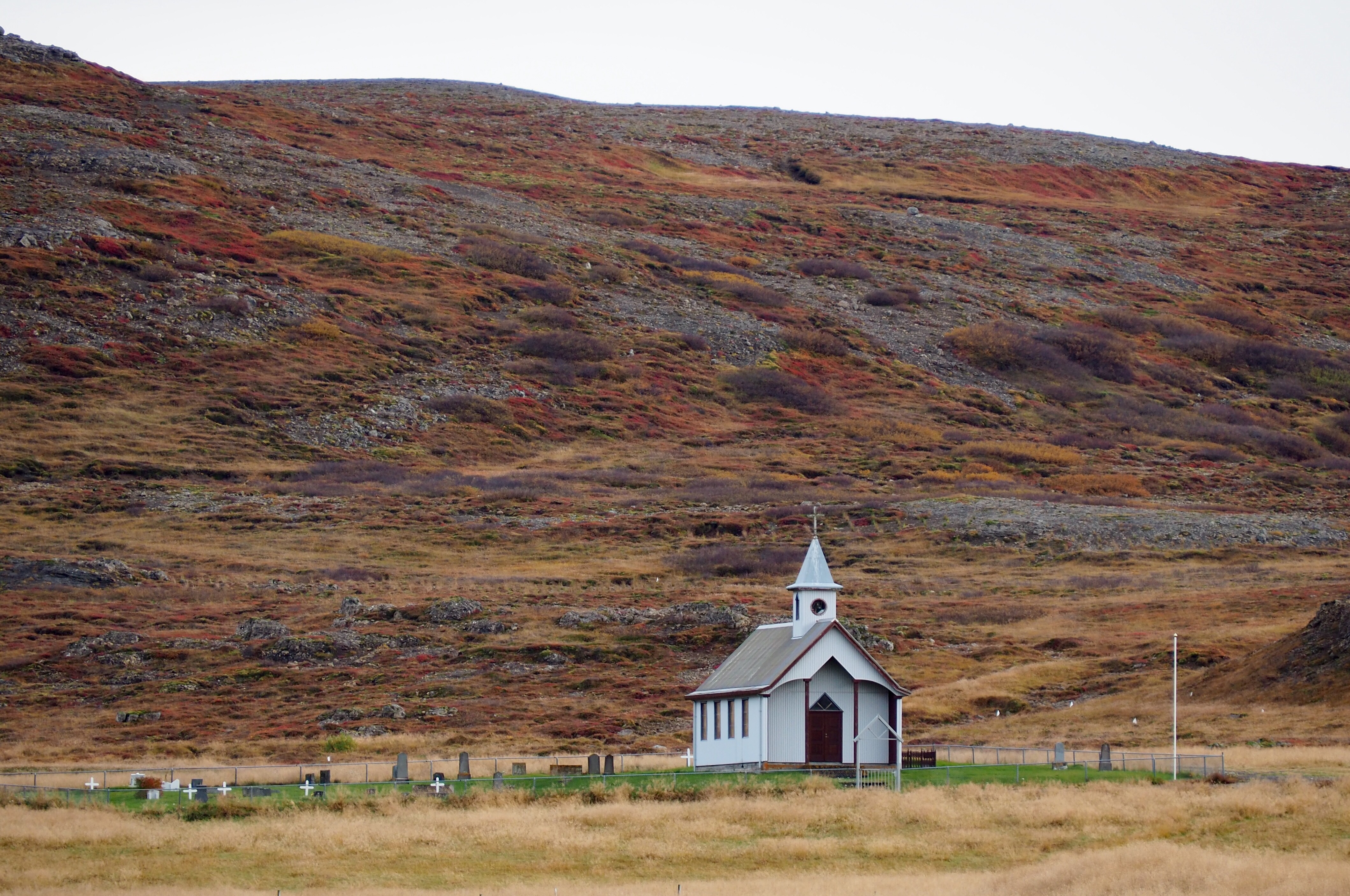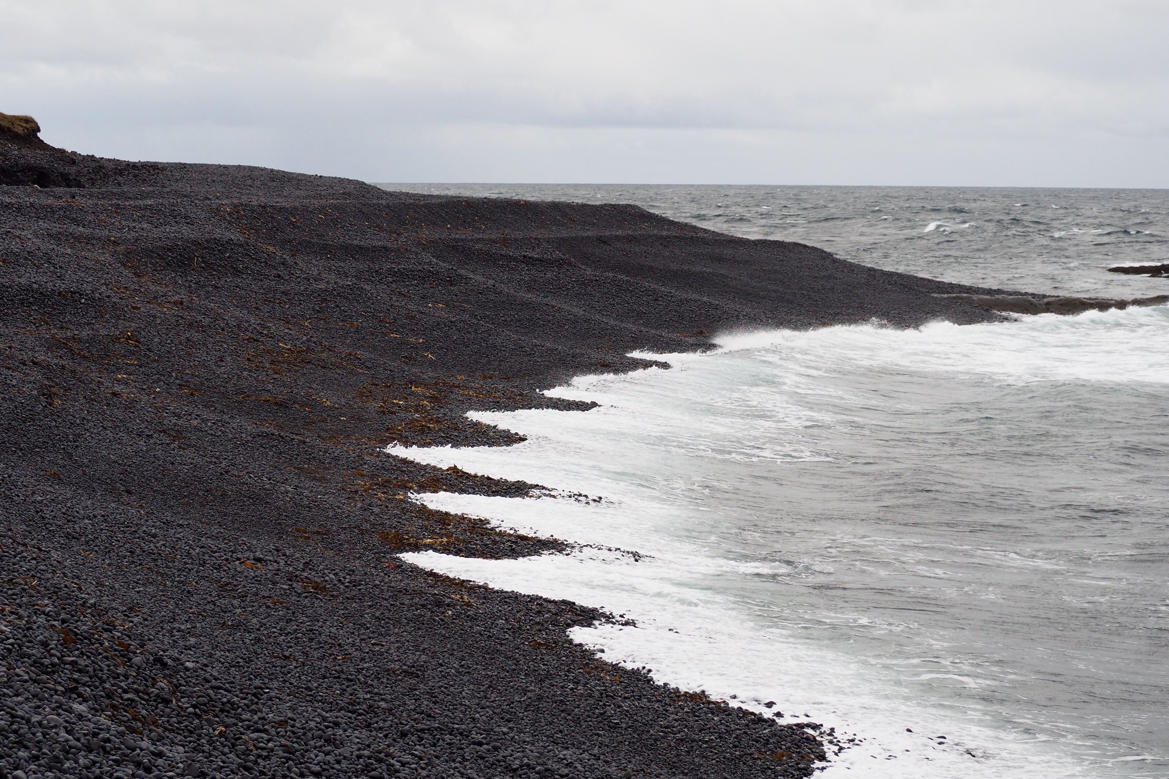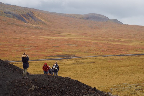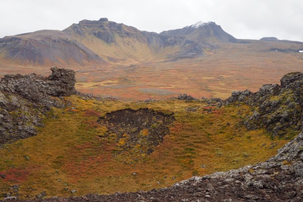 Smaller ancient volcanos are dotted along the peninsula, and the surrounding lava plains are an interesting mass of grey rocks covered with green moss. Very close to Snaefellsjokull large, abstract, jagged rocks sit exactly as they would have landed when they were spewed from the volcano more than fifteen hundred years ago. It’s eerily beautiful and truly fascinating. As you move away from the end of the peninsula, the rocks becomes browner, and are covered with brown grass and a small, pretty green and pink ground cover.