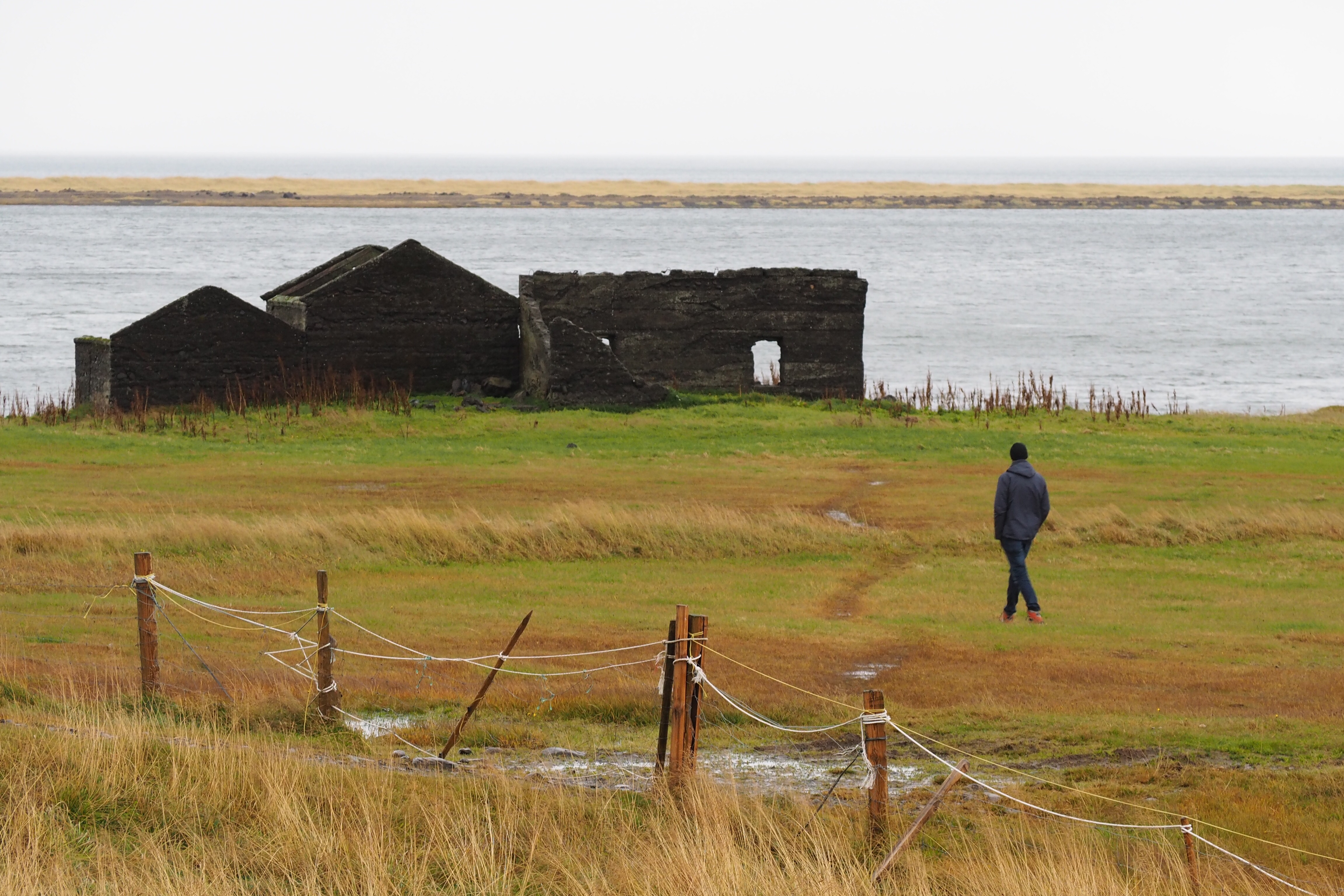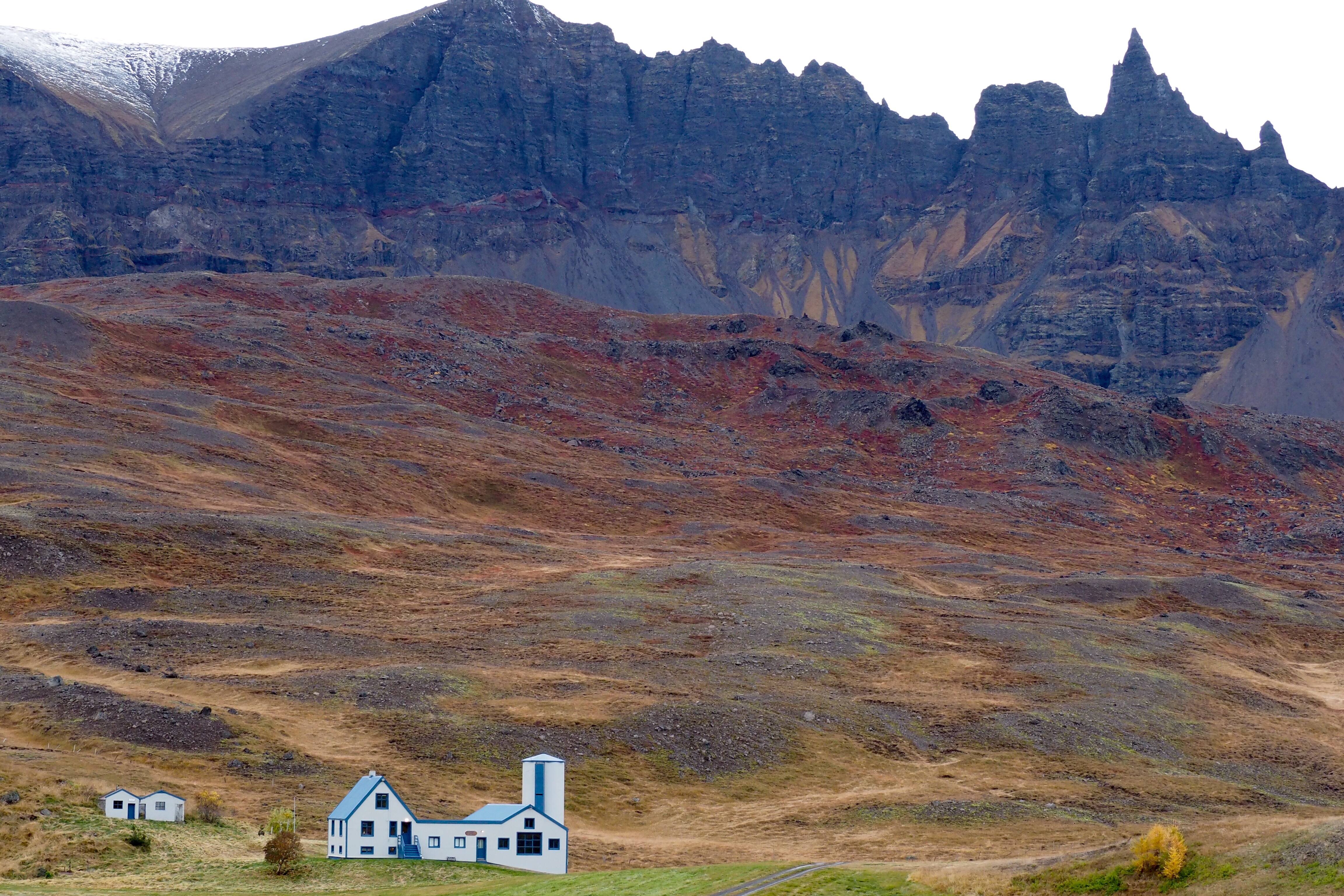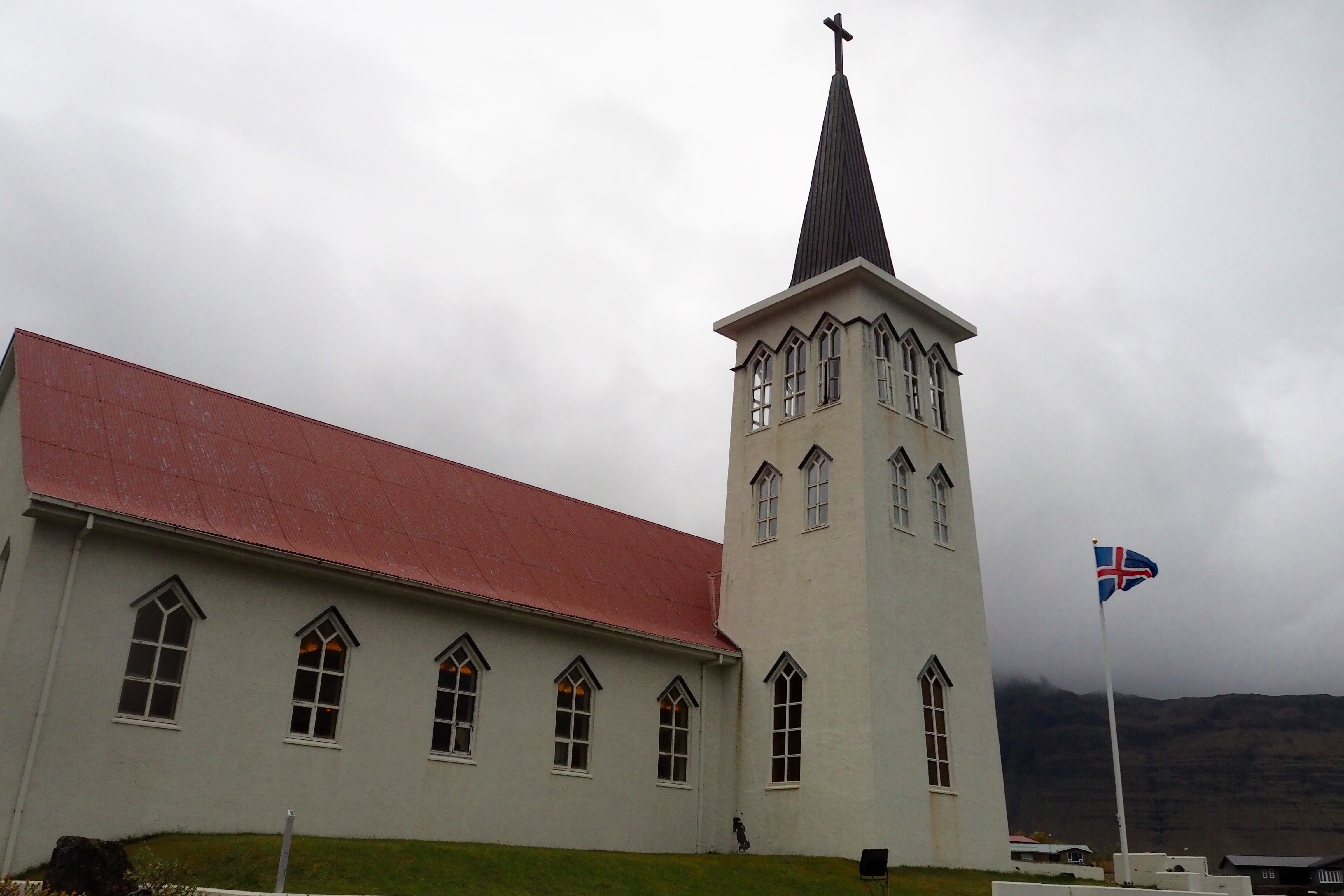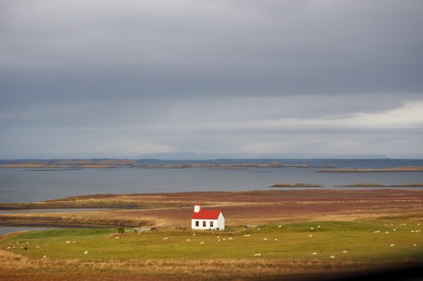 As we drove away from the peninsula and into the valleys of the north, the countryside turned very lush and green. We drove past farm after farm – neat and compact and filled with sheep grazing on the thick green pasture. They have long thick wool and are mostly white although most farms (like families) have at least one black sheep. The farm houses are white with a red or blue roof and accompanied by a massive barn – painted to match the farmhouse – used to house the stock over the winter. Alongside each barn was a mountain of hay bales, shrink-wrapped in white, pink, green or black plastic. We pondered whether the colours represented the type of hay (wheat, oats, barley) or its age. Or maybe they didn’t mean mean anything at all! These are the questions that get asked when you drive for hours taking in the landscape.