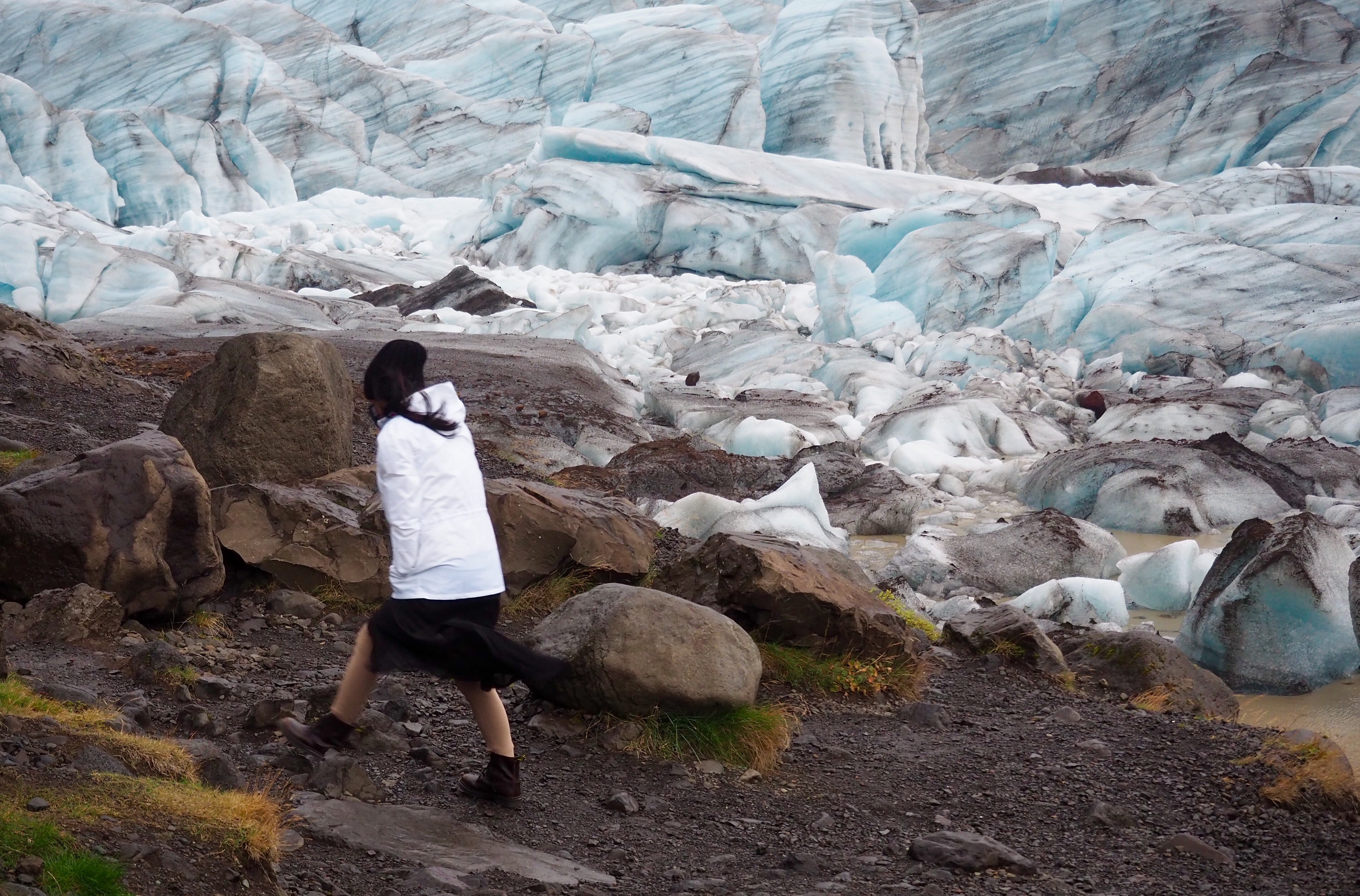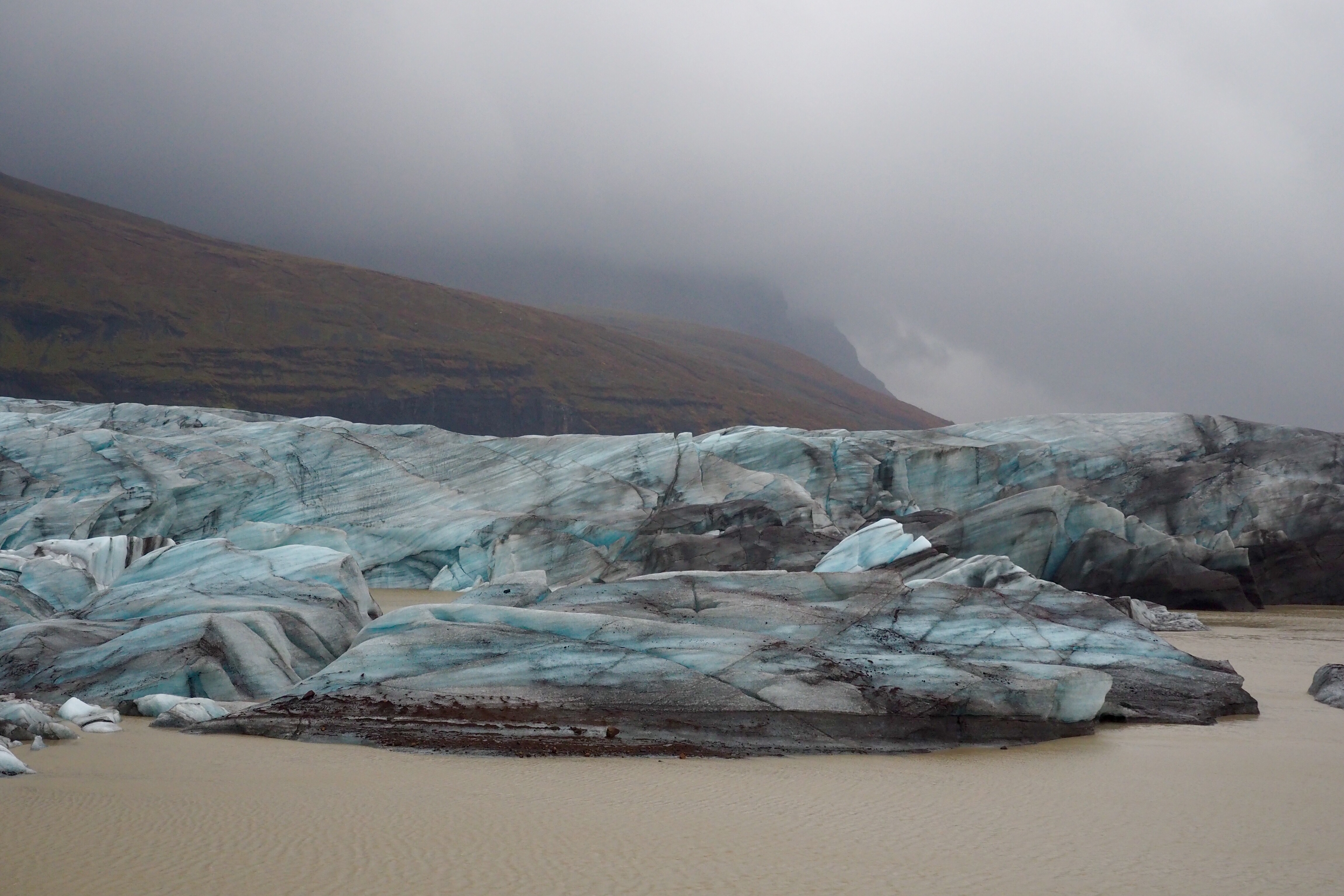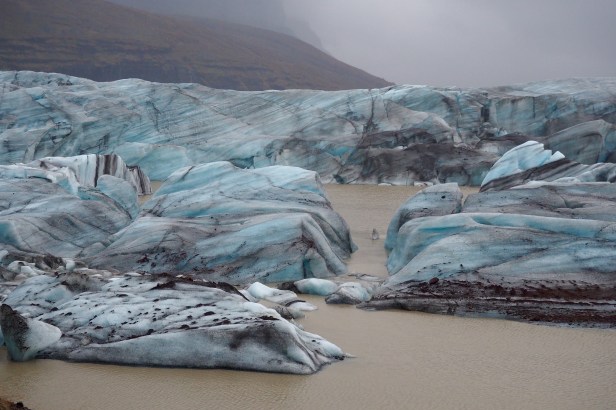 An hour or so further along we stumbled across a glacier that could be seen from the road so travelled down a track for a better look. Despite very high winds and freezing temperature we got out of the car and walked down a track to the glacier’s edge. We were well rewarded with a stunning view of the ancient glacier surrounded by milky brown water.