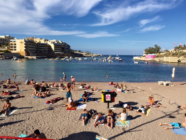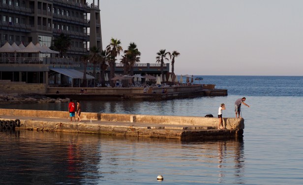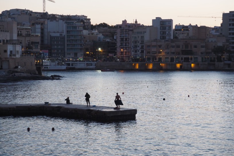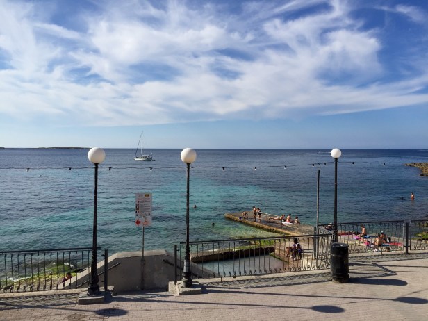 We stayed in St Julians which is very close to the water and full of restaurants and bars with stunning views across the bay. The water front has a walkway that runs for about 2 km from St Julians to Sliema with a constant stream of people walking, jogging and cycling along its path. It is particularly popular at night when families and couples take their evening stroll before dinner. Down at the water’s edge, swimmers and sun-worshippers lie on the rocks, sometimes taking a dip to cool down. The weather has been sunny and warm, around 25-30 degrees but it feels much hotter.