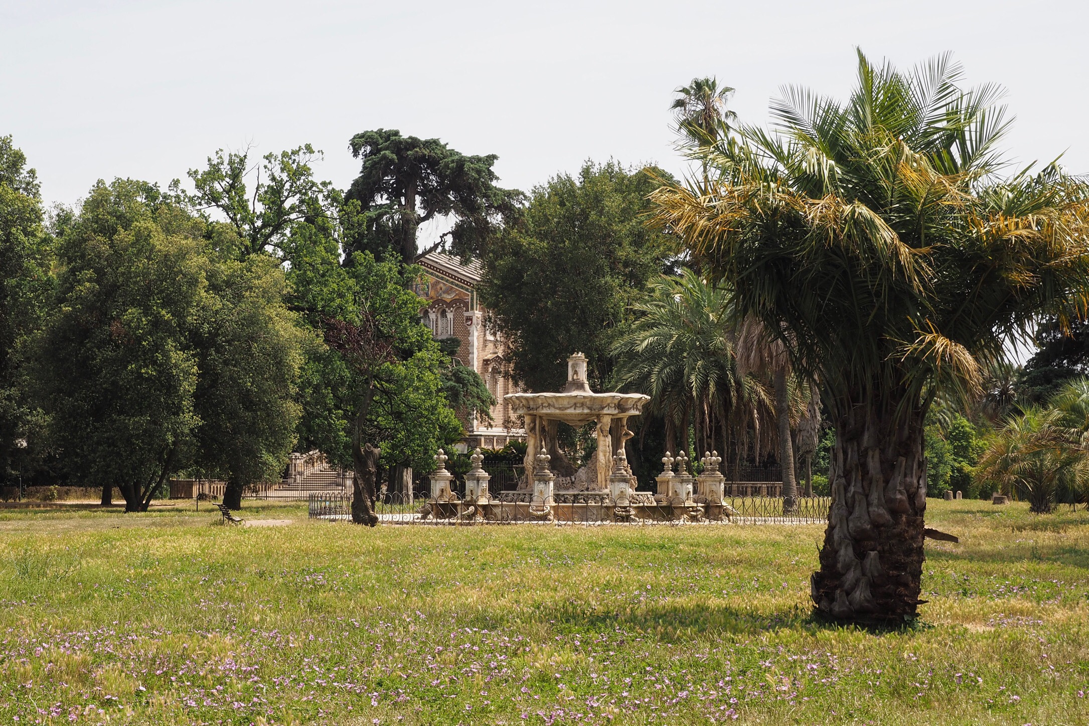 The surrounding parklands are wild and unstructured with some sections so dense with trees that it felt like we were walking through a forest. The grounds are mostly covered with thick wild grasses and large, shady trees. A small lake in the centre of the park is home to white swans and other bird life. Beautiful old fountains and monuments can be found among the trees as you wander about.