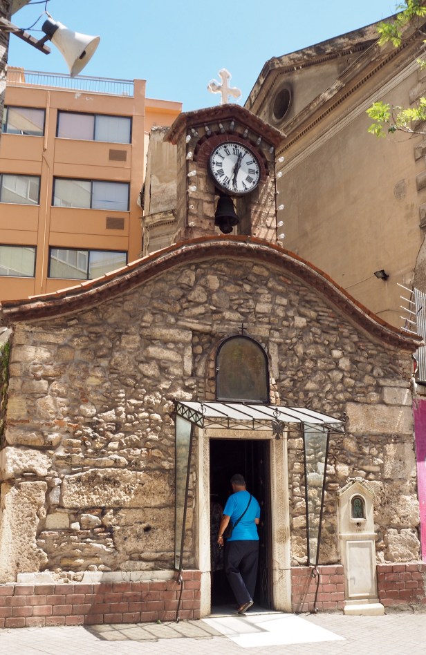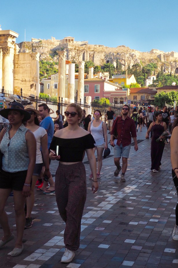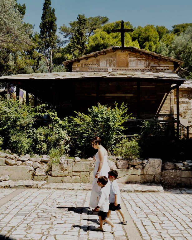I spent the good part of another day on a hop-on hop-off bus. I find these buses a really good way to see the city’s highlights and where you might like to revisit at a later date. The bus stopped at the Acropolis which is high on a hill overlooking the city. I got off at this point feeling I should visit this area renowned for its architectural and historic significance. The ruins are surrounded by some beautiful bush land which I enjoyed walking around particularly as there were very good views of the ancient ruins. I also stumbled across a tiny and very old Orthodox Church which was hosting some type of celebration, perhaps a Christening. I eventually found my way to the base of the Acropolis but decided not to go up when I spotted the very long queue waiting to buy tickets in the searing heat, and the hundreds of people swarming over the ruins.