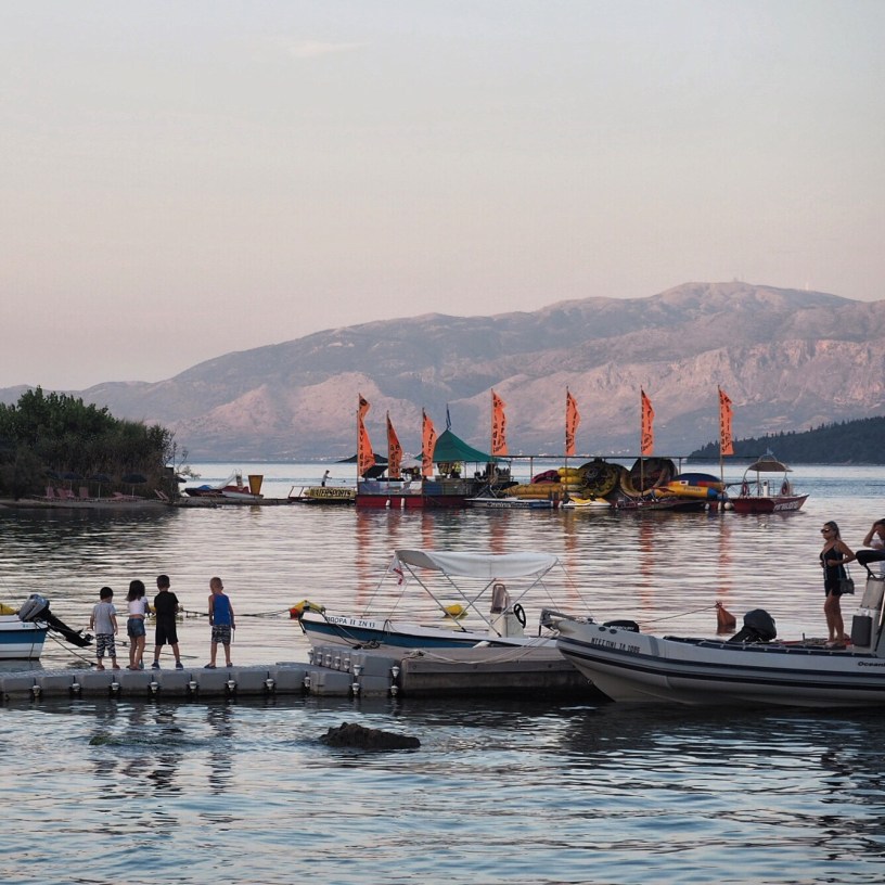 The next day we sailed further south to Tranquil Bay and the town of Nydri. Again we were able to tie up at the town quay. We couldn’t wait to change into our bathers and walk to the nearby beach where we rented a sun bed and umbrella for 3 euros – a bargain as it was extremely hot. We spent the afternoon swimming, reading and snoozing before heading back to the boat for drinks and to wait for the sun to go down, which at the moment is around 9.30pm. The heat here is very intense right up until sunset. Across Tranquil Bay is an island with a tiny white church overlooking the water. Nydri is a busy port and a popular beach resort so there was much going on to keep us entertained until it was cool enough to venture out for dinner.