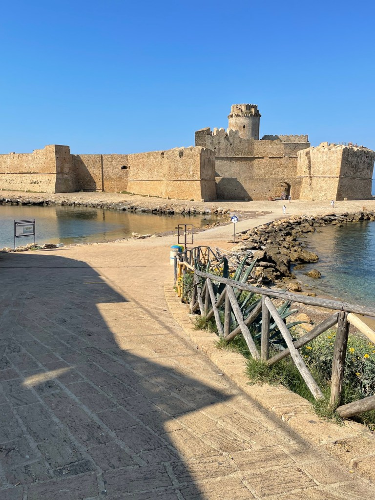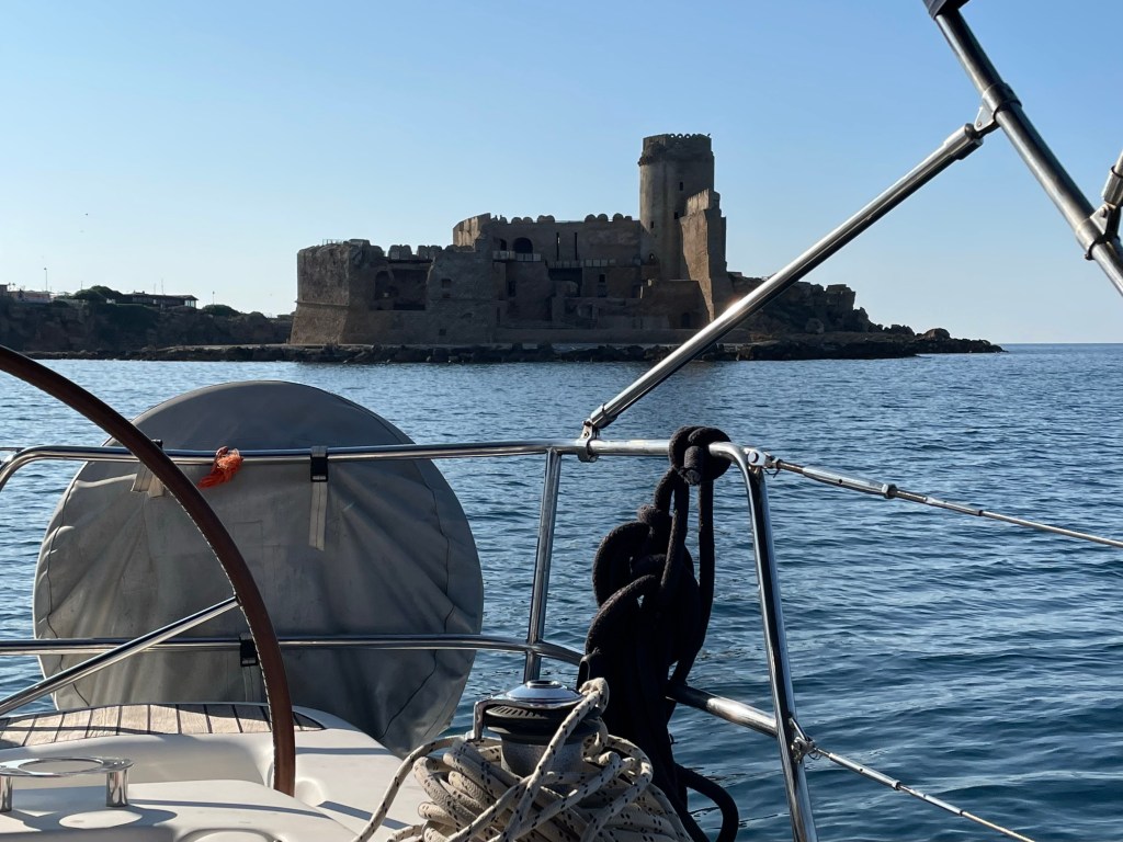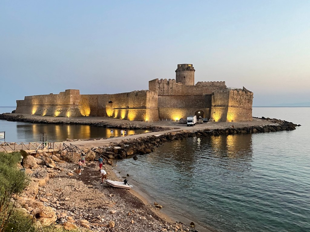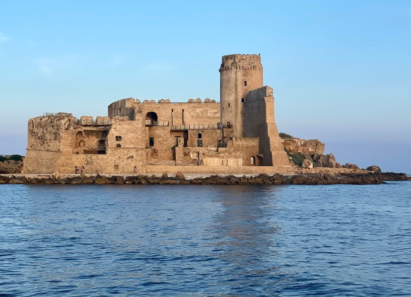 As predicted, the crossing was long but the weather good and we had both sails up and no motor for most of the trip. We’d planned to anchor off Le Castella but knew very little about the small town. A quick google check when we were back in mobile phone range revealed that its name came from the 5th century BC castle located near the town. The castle was built by the Greeks as part of their colonisation of southern Italy, then called Magna Graecia (Latin for Greater Greece). As we approached we saw that it was spectacular. From some angles it appeared to be floating on the sea and in certain light looked like a giant sandcastle. Needless to say, we anchored nearby and after our long journey spent the night on board having dinner and enjoying an amazing view of the castle.