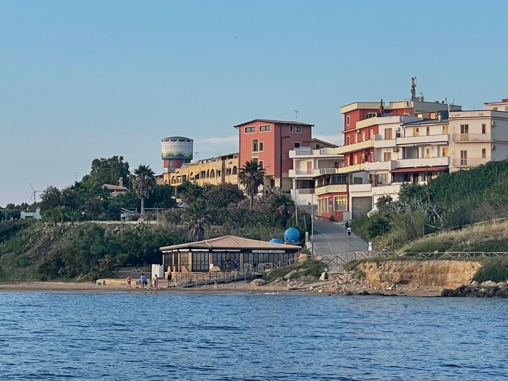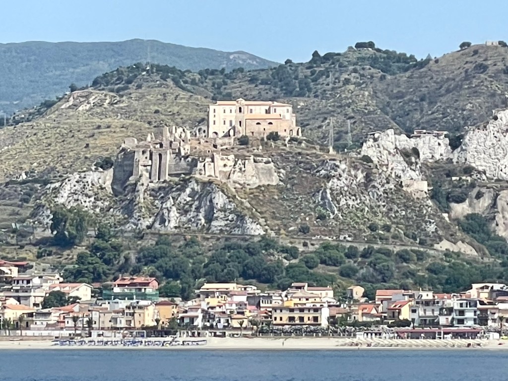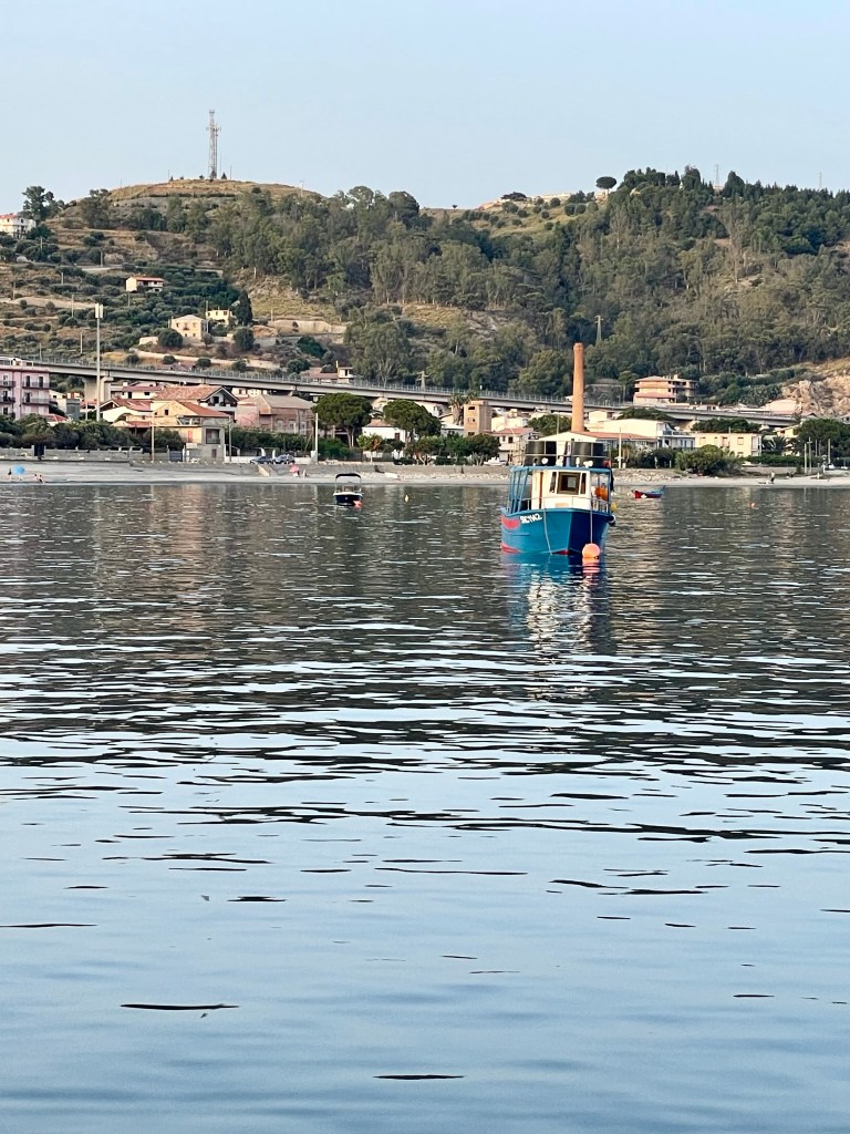 The following day we headed for our last southern Calabrian destination – Bovo Marina – not an actual marina but a small town on a bay that would give us some protection from winds. The journey was much more interesting as most of it was close to land and we enjoyed seeing the different landscapes and towns while we discussed what the farms might be growing. We also saw our first sword fishing boat, known as a Passarella, which has a seat high up a 30 metre tower in the centre of the boat. The pilot sights the fish from there and steers the boat to chase it. At the front of the boat is a long bridge where the harpooner takes position to aim for the swordfish. We’d been told they mostly fished in the Messina Strait so were surprised to see one on this part of our journey.