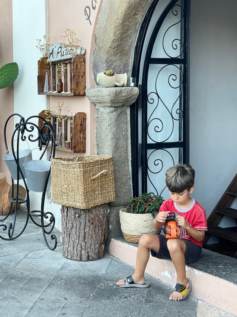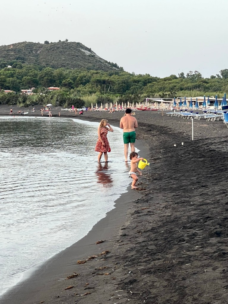 Our first stop was Vulcano, the most southern of the islands. It is one of two Aeolian islands with an active volcano, although it has not erupted since 1890. We anchored in a bay on the north-west side of the island away from the main port and ferry traffic. The volcano sat in clear view behind the restaurants and hotels that lined the bay. The volcanic sand on the beach was black and a stark contrast to what we’d experienced. Nonetheless, the children built sandcastles, buried their parents under wet sand and frolicked in the shallow waters, just as they would at home.