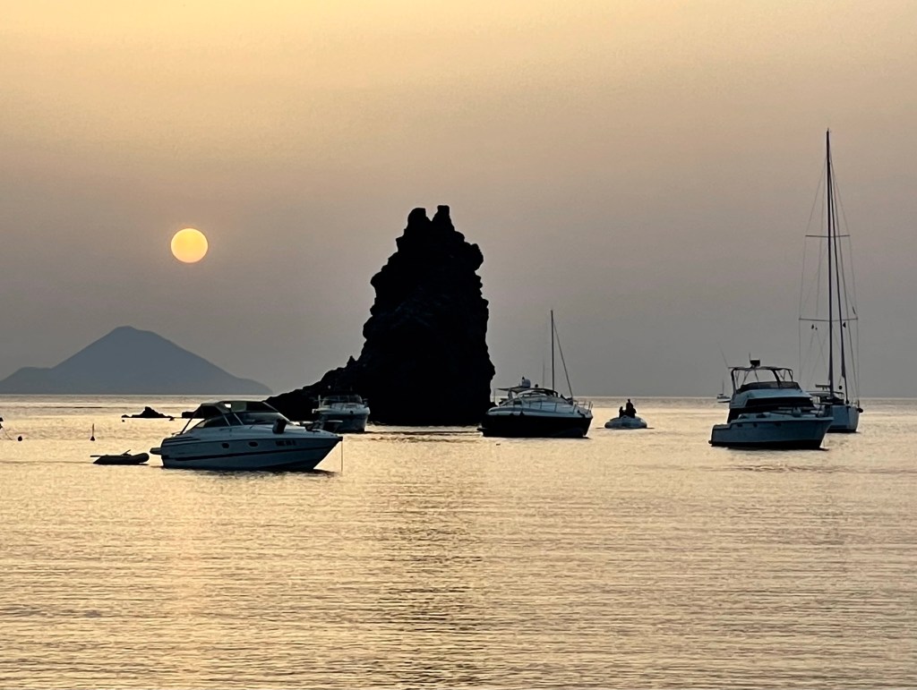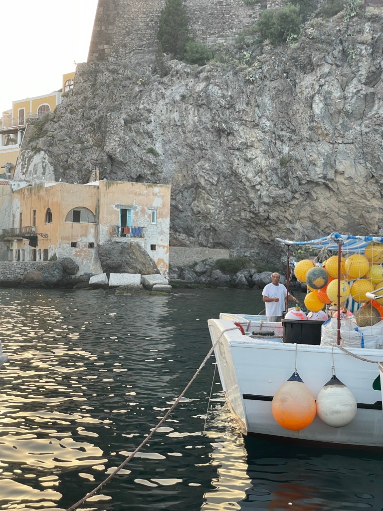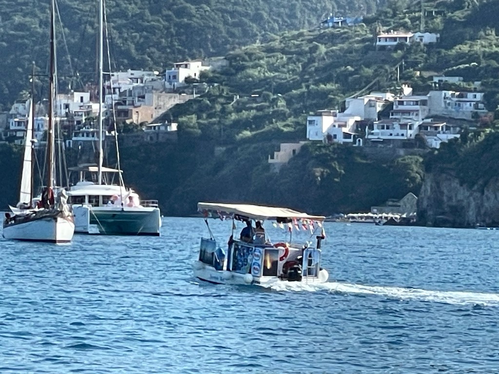 While relaxing onboard we heard a familiar voice calling ‘pesche, pesche’. It appeared our fishermen went further abroad than Vulcano! Not long after, we heard loud, jangly music coming from another passing motorboat. They were selling ice creams! We’d seen nothing like this in the Greek islands.