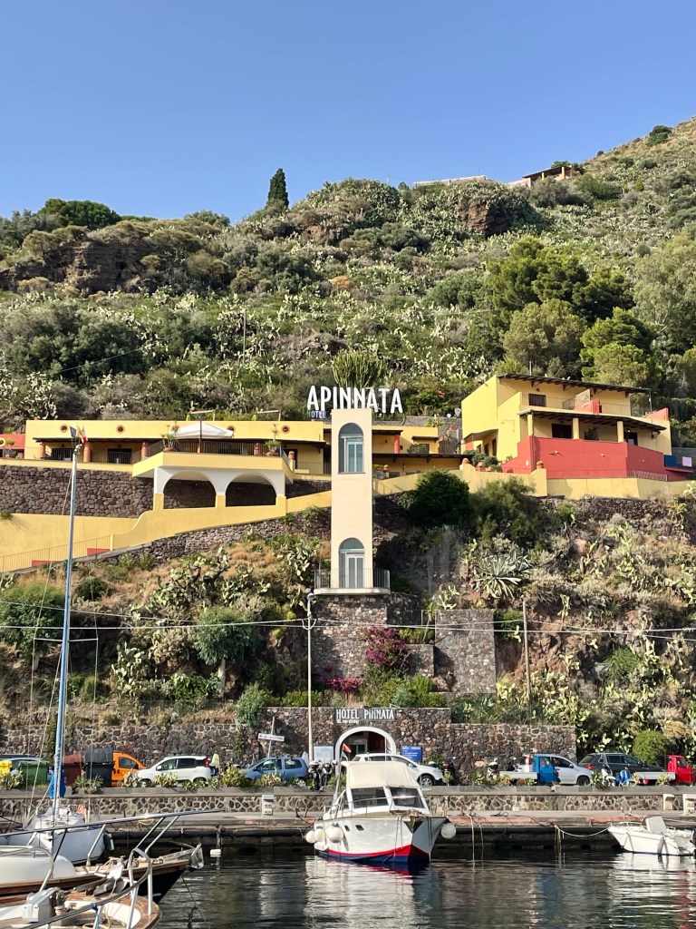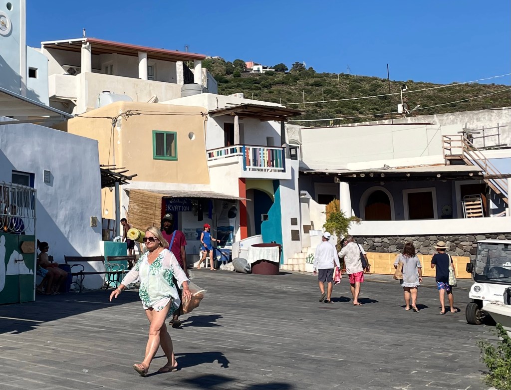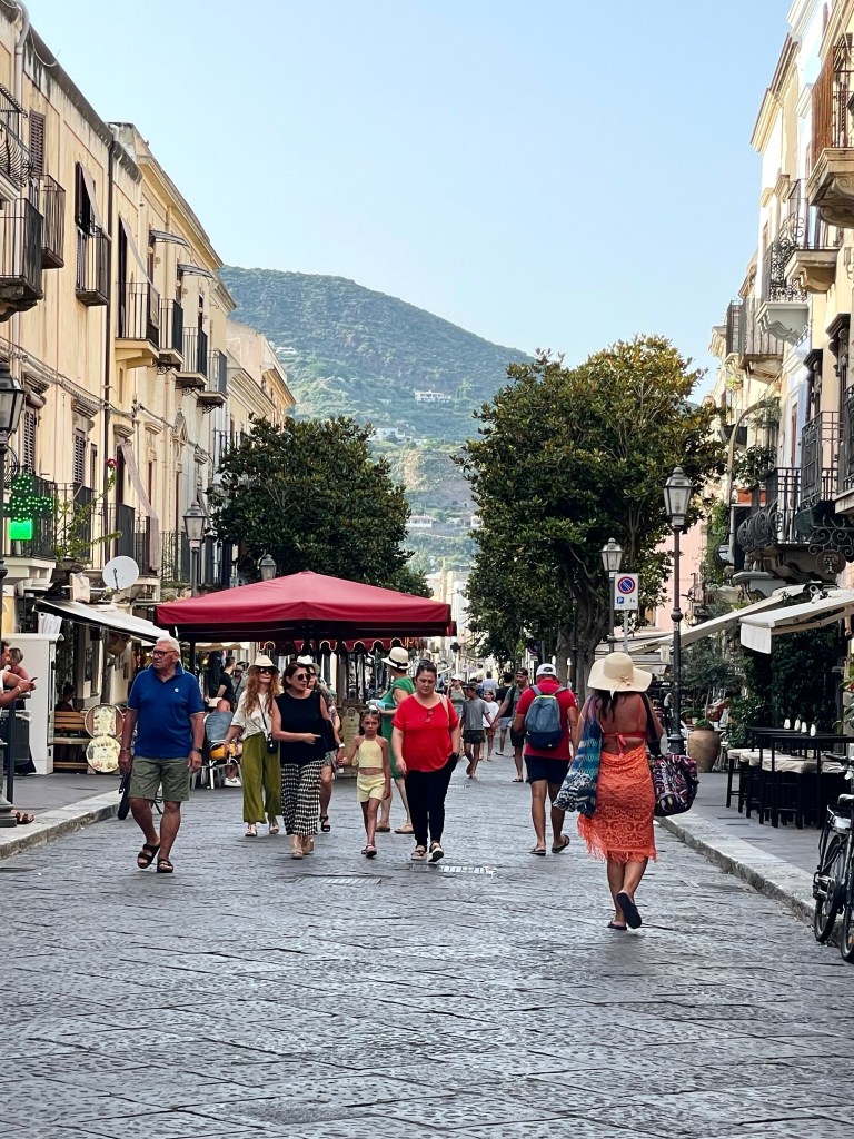 It took us about an hour to motor to the nearby island of Lipari, which is the largest of the Aeolian Islands and has a very busy ferry terminal in the main town (also called Lipari). We wanted to be away from the rough wash from the ferries and passing ships so had booked a marina a few kilometres away knowing they had a courtesy bus into the town. That evening we wandered about the old town enjoying the cooler weather and the busy shopping centre before eating a beautiful dinner at a restaurant overlooking the water and port area. There was a stage set up in the main piazza and a band was rehearsing. We were now extra pleased to be away from the action as it was shaping up to be a very noisy night ahead. I’d visited Lipari on a day trip many years ago, but for some reason the town seemed much larger and busier this time around.