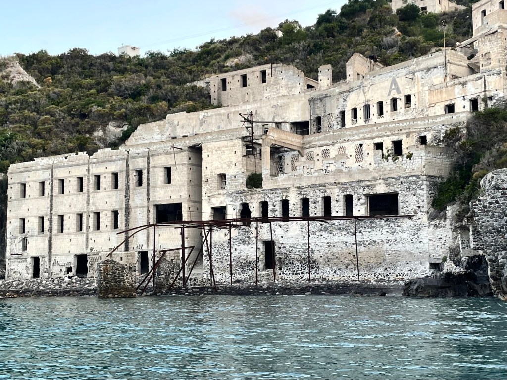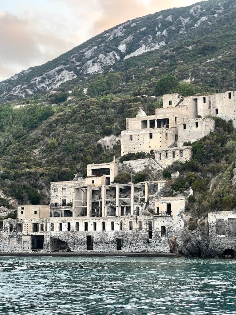We dropped anchor near the shell of an old stone factory and a quarry. Further ahead we could see a long, disused pier. A look on Google revealed that it had been a pumice stone quarry until 2007. There was much controversy at the time as it had employed many locals who did not want the quarry and factory to close. Later we motored along the shore in the dingy, checking out more factory buildings and the old wharf which would’ve been used to convey the stone onto ships.