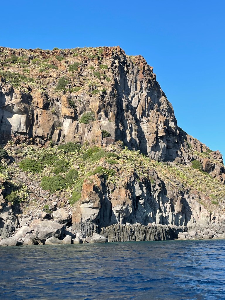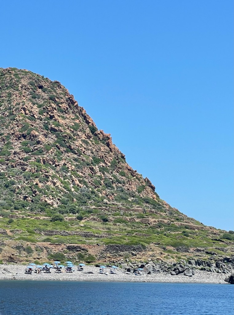 Our final stop in the Aeolian Islands was Filicudi, which is a three-hour motor sail from Lipari. We’d planned to tie up to a mooring buoy near the small fishing town of Pecorini. There was a small hotel and a few shops and houses but a large ship sitting in the bay made it a bit less inviting, so we anchored in a nearby bay instead. Later we took the dingy to the town to buy water and food. It was so very hot and humid that we couldn’t wait to get back to the boat for some breeze. The terrain of the island looked quite different to Vulcano and Lipari and we decided it would be a great place to explore some more next year when the weather is a little cooler.