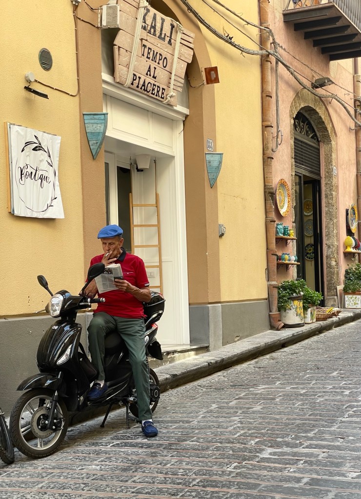 Breakfast menus in Sicily are very limited compared with home. Most cafes offer coffee, brioche and croissants, which they refer to as cornettos. Unless you are ordering an espresso (short black) or a cappuccino (much stronger than at home) you can never be sure what to expect when ordering a coffee. The same drink can vary greatly between cafes. A flat white or café latte doesn’t exist in Sicily. Latte macchiato is on most menus and is similar to a café latte, but I’ve had many different versions, some very milky and in a tall glass, and almost always with long life milk (yuk!). The croissants however are almost always delicious and a variety of fillings are available – always apricot jam (referred to as marmalade) and chocolate, and mostly pistachio, vanilla cream (custard) and sweetened ricotta.