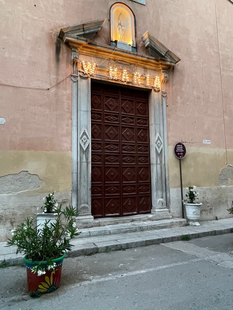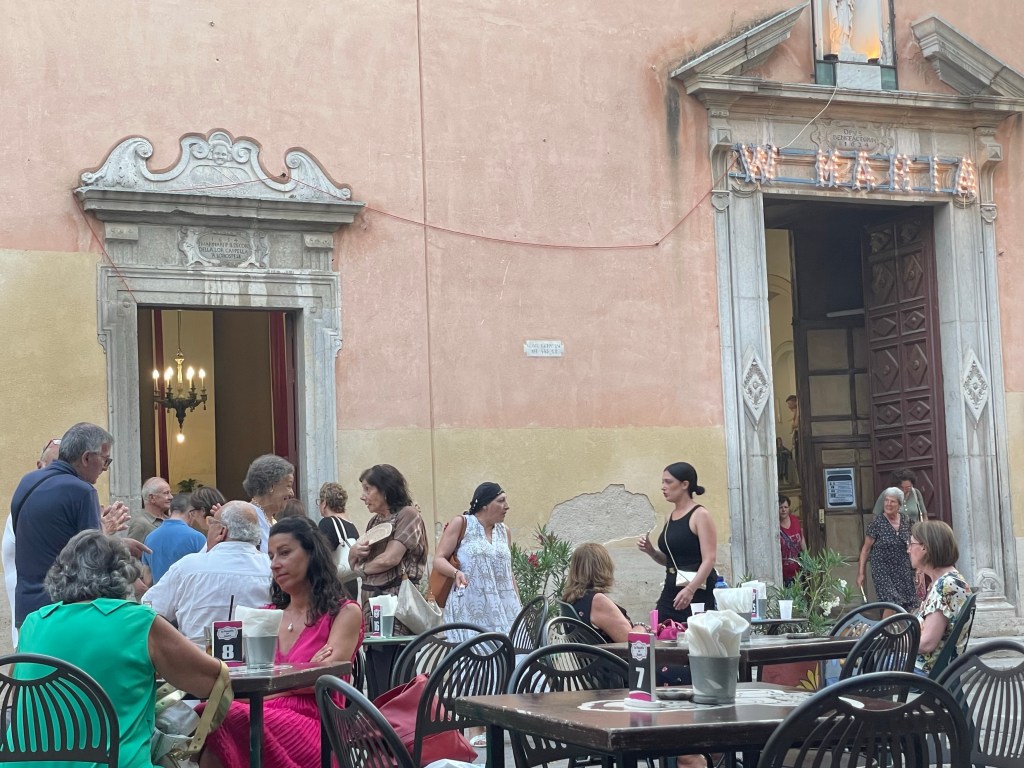That evening we went out for final drinks and dinner with our crew who were leaving the following morning. We discovered a bar in a tiny piazza set back from a busy street. Across from the bar was a church with its name – W Maria – up in lights above the door. It was unusual but quite charming. The church was full for the Saturday evening service. As I peeked in, I could see many of the women looking for some relief from the heat, their handheld fans swishing back and forth as they sang.