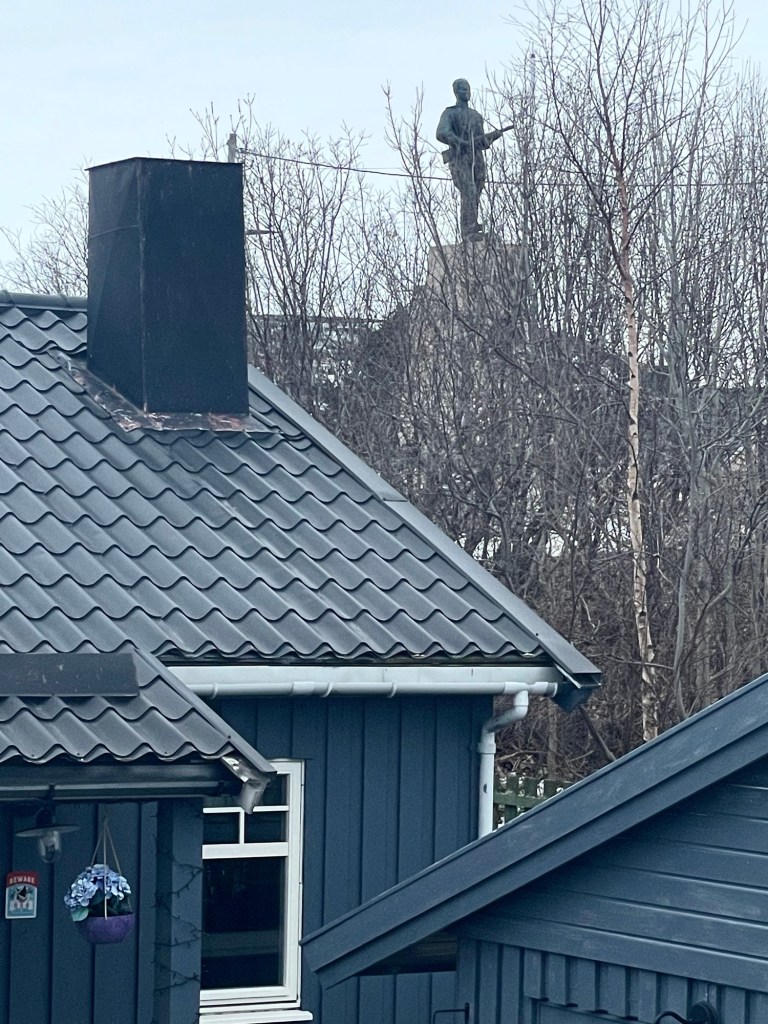 There were a few signs of our proximity to Russia, including a tour bus to the border. Outside our apartment window I caught sight of a statue of a soldier with a gun, high above the houses … a Soviet freedom statue, commemorating the liberation of Kirkenes by the Red Army in 1944, from German occupation.