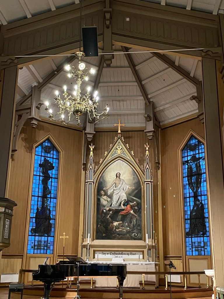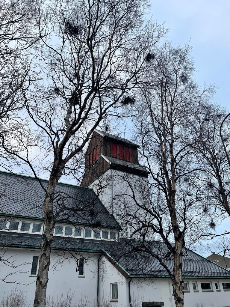 Later that night we stopped at Tromso and walked from the boat to the beautiful wooden Cathedral for a midnight concert, where we listened to a trio of musicians perform Nordic classical melodies and folk tunes. The acoustic sound in the church was perfect for their performance. Afterwards, when we walked back to the boat in the very early hours of the morning, the sky was still a bit light. It felt very strange.
