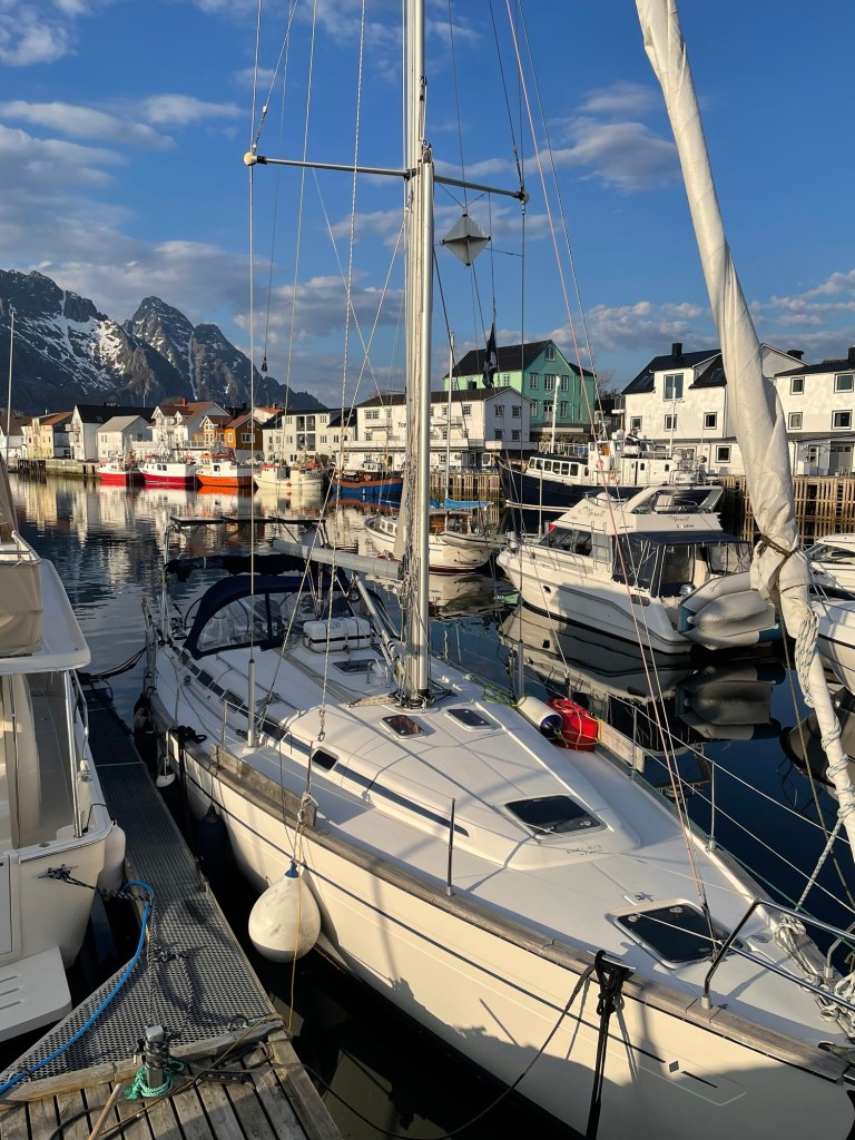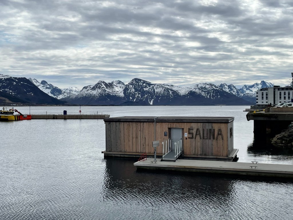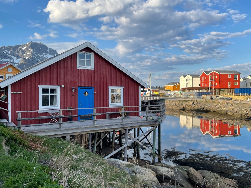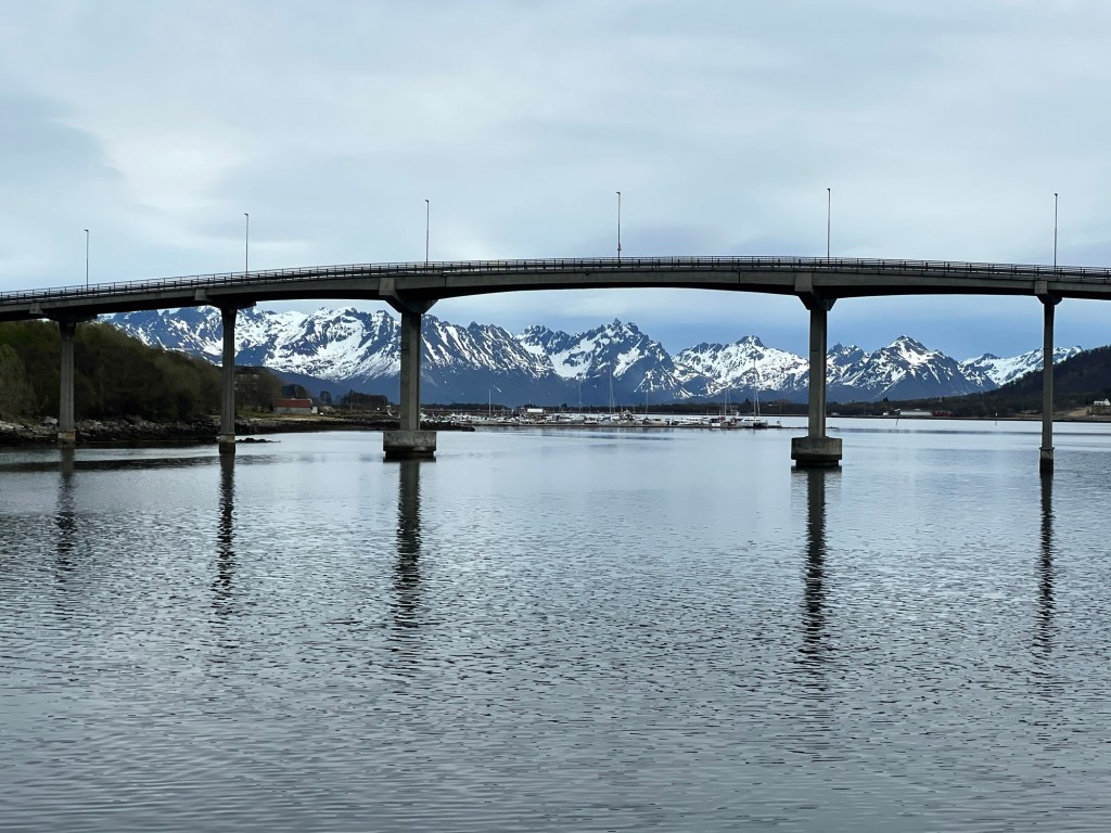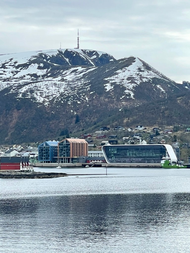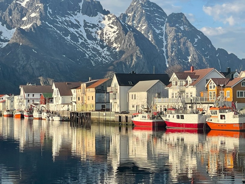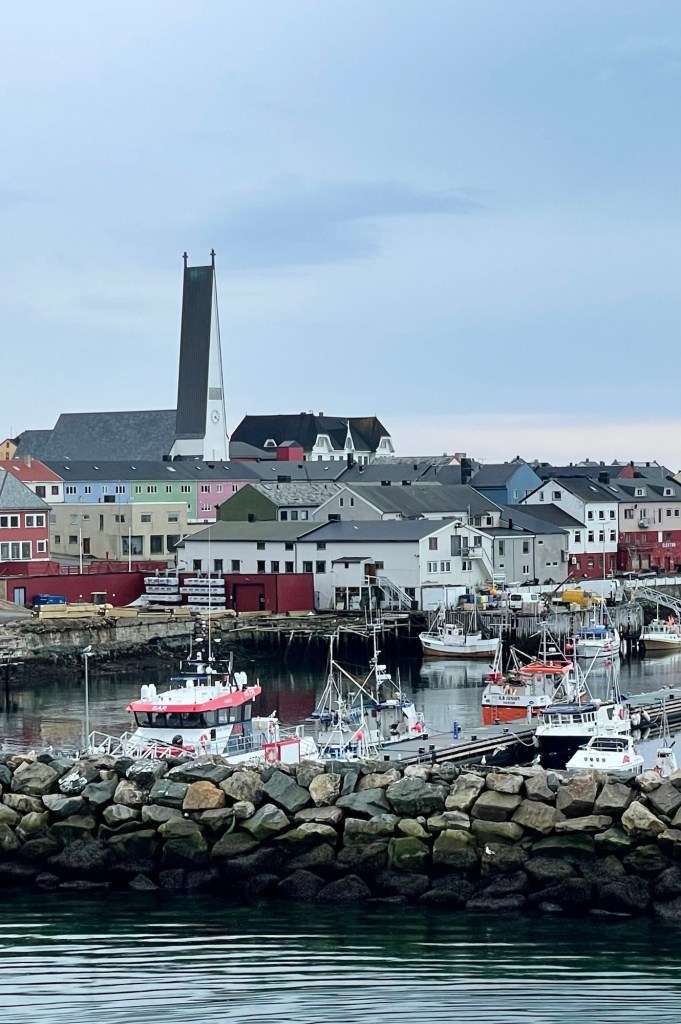 The weather was much better the following day. We sailed between islands and past fjords. There was so much to see and the scenery was spectacular. In the evening, we toured the beautiful Lofoten Islands by bus, spending ninety minutes in the small and picturesque town of Henningsvaer, located mostly across the islands of Heimoya and Hellandsoya. The town is still a fishing village, evidenced by the large number of cod drying on wooden racks as you enter the town, but draws many tourists thanks to its charming architecture and proximity to water activities. During our visit, we saw many camper vans and caravans there for Codstock, a three-day blues festival. Our guide talked about the ‘midnight sun’ the term they use for the period when there is 24 hours of daylight, generally between 28 May and 14 July. From 6 December to 6 January they experience the ‘blue hours’ when it is mostly dark and the sky is deep red and blue for just a few hours each day.