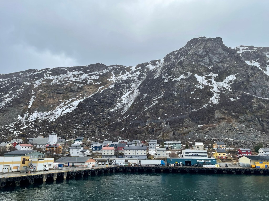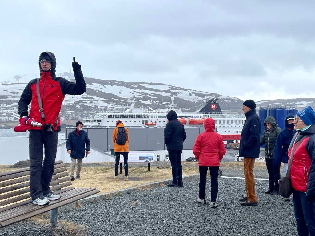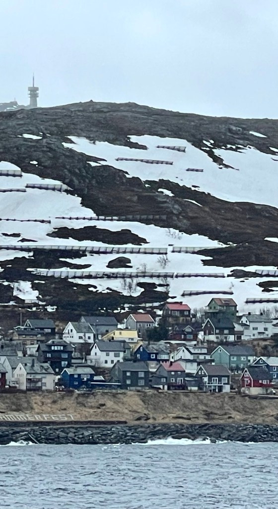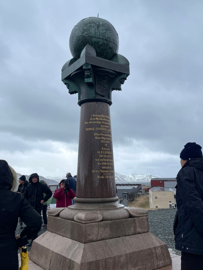 The second day we sailed along the north coast. The weather was bleak and the sea was choppy. There was not a lot to see other than snow-capped mountains and many of those were covered with fog. Due to the bad weather, we docked at Hammerfest an hour later than scheduled and so the excursion we’d booked … The Northernmost Town in the World … was cancelled. Instead, we had a short, guided tour to the meridian column. This column commemorates the first survey to determine the size and shape of the earth and marks the northernmost measure point. It was very cold and wet but nice to be off the ship for a short time.