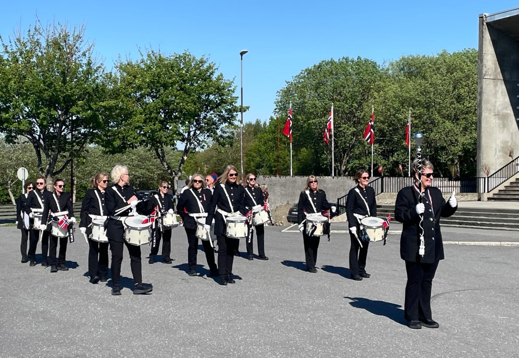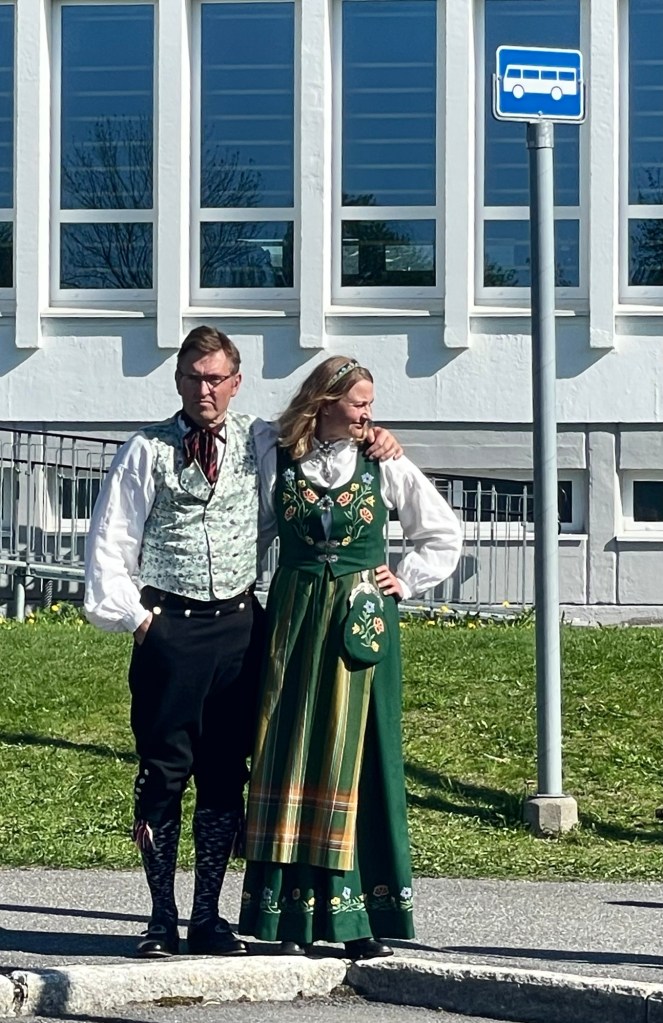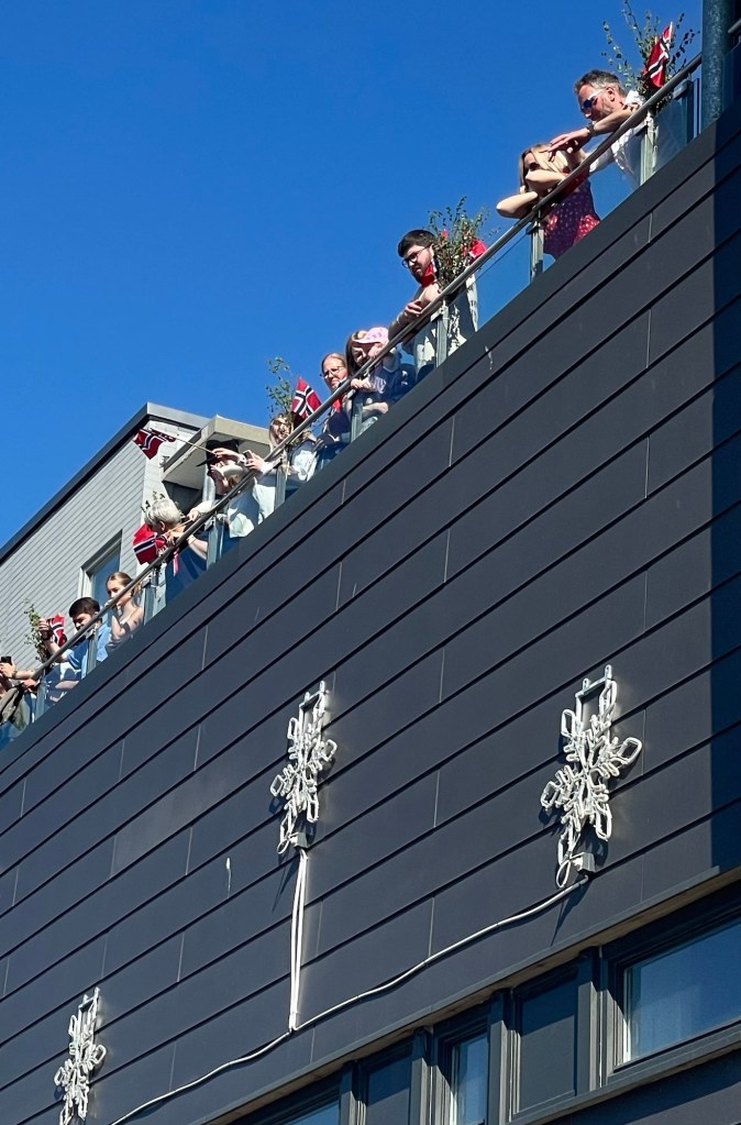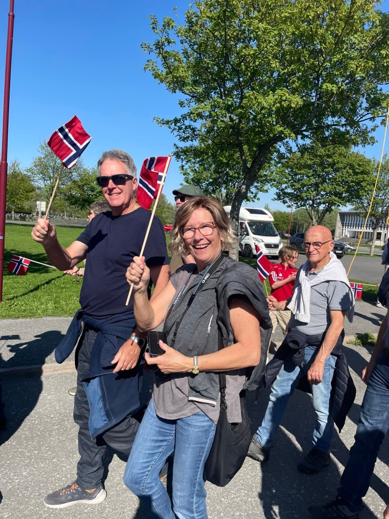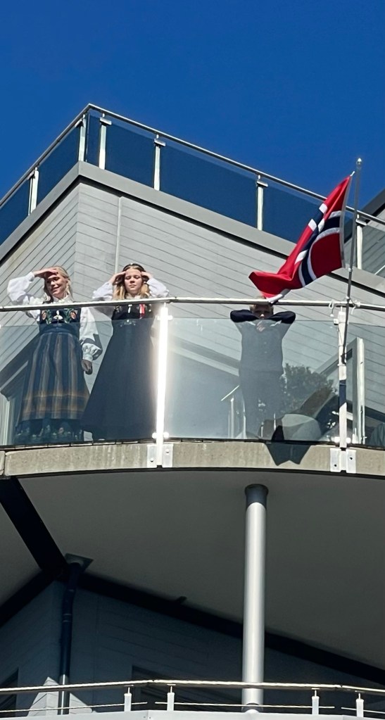 On the day, we all walked to the town hall with the crew and prepared to march. The local firefighters led the parade, followed by a brass band and then us! Most of the crew and many of the locals wore national dress. Behind us were many small, local sporting and interest clubs. There were so many children and lots of music and noise. The town’s residents lined the streets or looked down from their balconies, waving small Norwegian flags and shouting ‘hip, hip, hoorah’. It was a very special experience and we loved being a part of it.