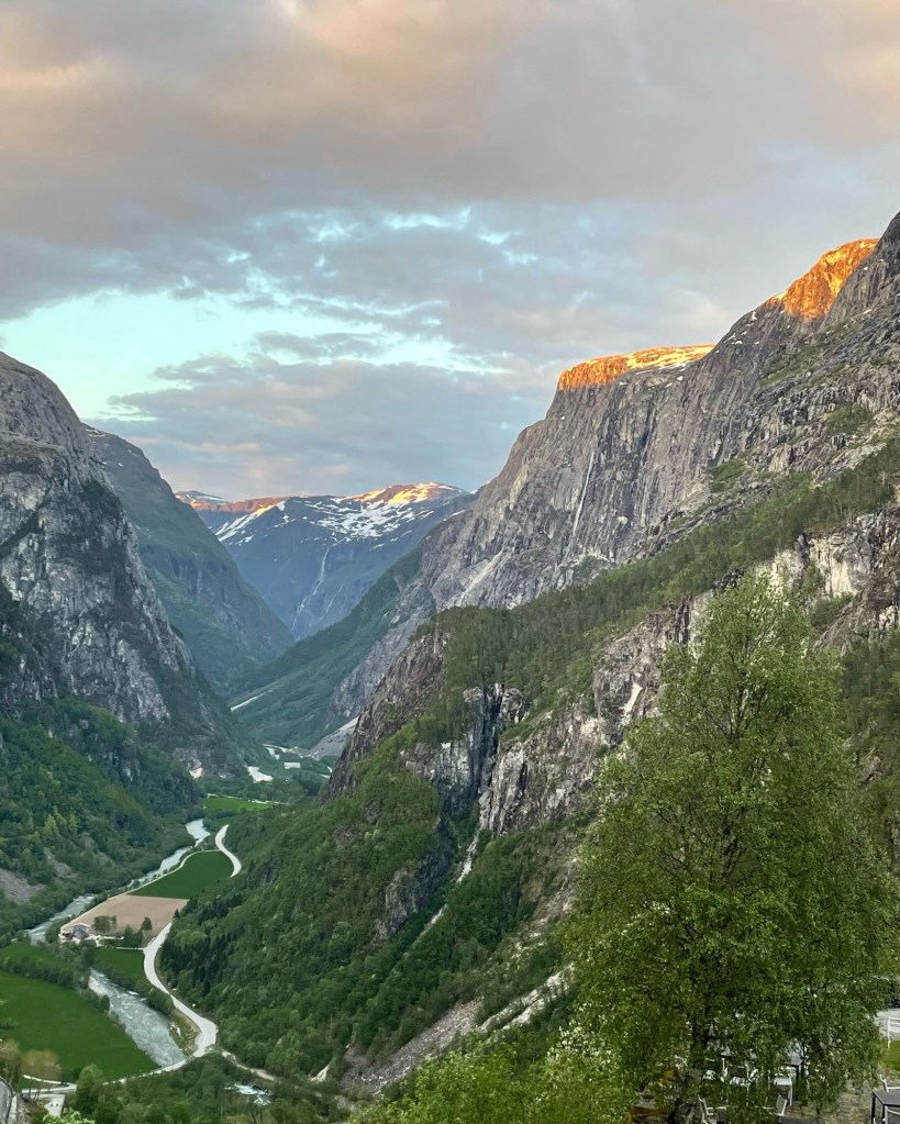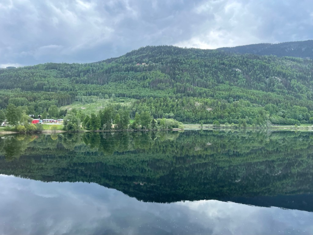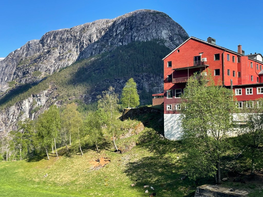 Early the next morning we walked to the train station to begin our three-day journey to Oslo, starting with a scenic train ride to Voss.  We then transferred to a bus which took us to our hotel at Stalheim. Built in the late 1800s, the hotel has amazing views across the Naeroy Valley, and we spent the rest of the day enjoying the hotel’s facilities and grounds. In the afternoon I took a short walk and spotted a team of cyclists riding by.  Their support crew was nearby and I later discovered that they were the Norwegian cycling team. I guessed that they were training for an event … perhaps the Olympic Games.