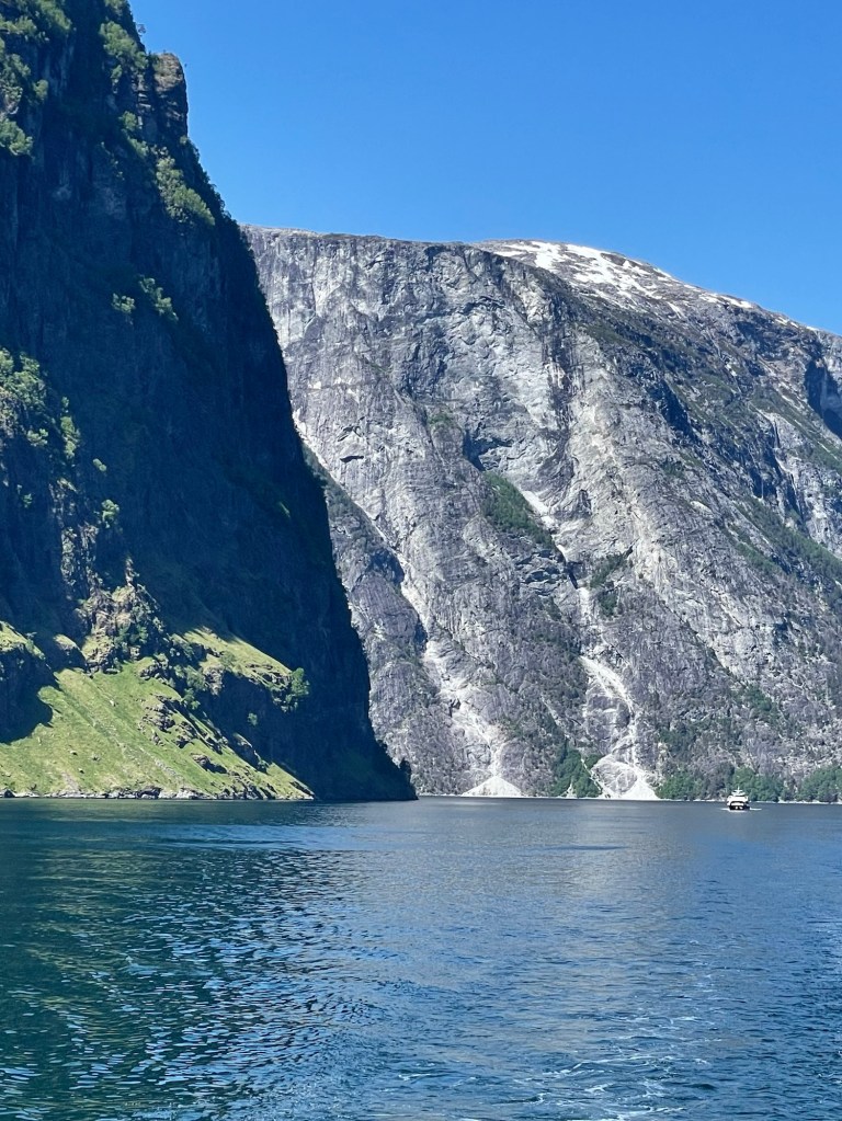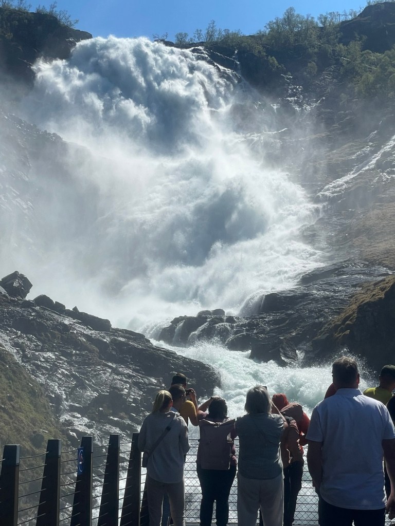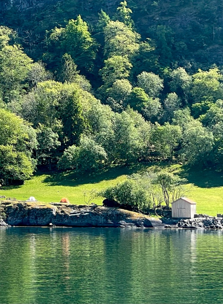 The bus picked us up the next morning and took us to a large ferry.  For the next two hours we enjoyed an amazing view from the boat as we sailed along the Naeroyfjord to Flam. It was an electric powered ferry which meant that it was totally silent.  Flam is a beautiful village with amazing views across the fjord.  Unfortunately, there was a massive cruise ship docked there when we arrived, dominating the town and the views. It seemed totally out of proportion for the size of the town.  We met friends from home that evening for pizza and beers, served from a food van in the camping ground. This was one of the few places in town still open after the cruise ship departed, but the pizzas were good and the company even better. We had a fabulous night sharing travels stories and chatting.