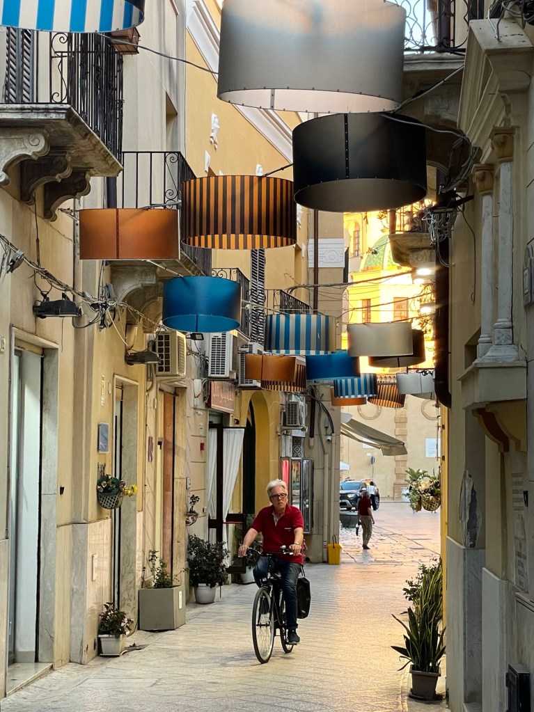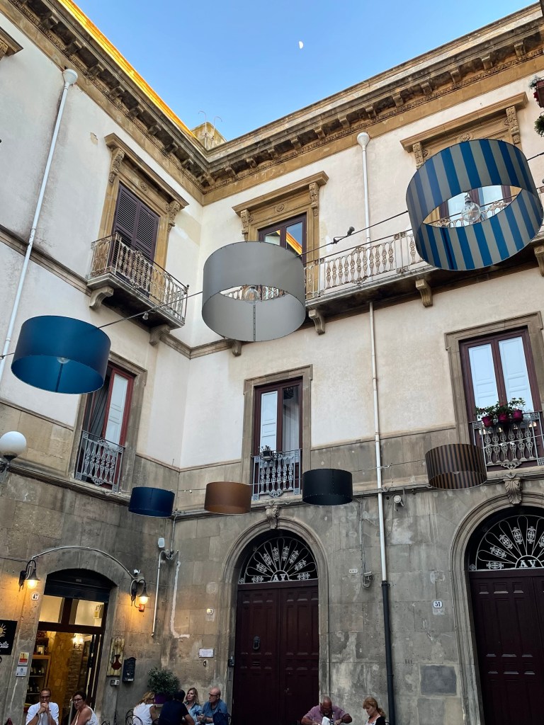 That evening we walked into the old part of town to look for somewhere to eat. Most Sicilian towns have a beautiful church in the heart of the old town and Mazara was no exception. There had been a large wedding at the church a few hours earlier and many of the beautifully dressed guests were standing around the nearby piazza chatting. We wandered the streets behind the church. Many had large, colourful lampshades strung overhead between the buildings. We found a restaurant in a small piazza and sat down. It was a really nice atmosphere with many locals around us enjoying dinner with their families.