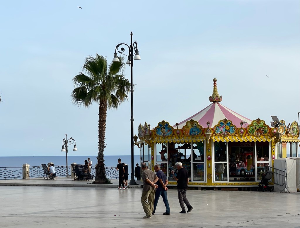 Before taking off the next morning we made sure our depth metre was working. We couldn’t control the wind but we could at least make sure we didn’t run aground. Our next stop was Sciacca, another four-hour sail further along the south coast. It was an easy sail with light winds and we had a much easier experience getting into the marina. The town was built on the side of a large, rocky hill and we could see a terrace next to a very grand building part way up. That evening we walked up many stairs to reach it. The view across the marina and Mediterranean Sea was stunning and well worth the climb. The piazza was quite large and had a merry-go-round and other entertainment for children. We wandered further up the hill along the streets behind the piazza eventually finding a place in a small courtyard to have dinner. It looked a little more upmarket than our usual choices but the setting was lovely and we were getting tired of walking around looking for somewhere to eat. The menu was limited but the dishes sounded interesting. The waitress came out to take our drinks order and suggested we share some of their arancini as an entrée. We ordered one filled with smoked eggplant rice, swordfish and almond pesto. It came on a bed of yellow tomato coulis and mint oil. We also tried their special arancino filled with rabbit ragu and fennel, served with carrot cream. They were amazing! Our main courses were just as delicious and we walked back to the boat feeling very satisfied.