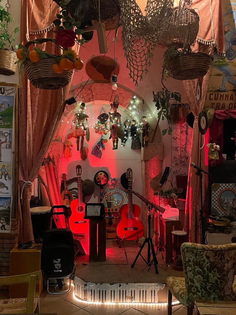 That evening, we left the marina to wander about the old town section of Licata. It was noisy and busy, but quite interesting. We discovered a small shop with two old men sitting next to the entrance. As we peeked into the doorway, one of them encouraged us to enter. At one end of the room was small stage lit up in red with three guitars sitting at the back on stands. At the front of the stage was a chair and microphone. There were two rows of chairs facing the stage. It was a tiny shop, so there were only about a dozen in total. The rest of the shop was crammed with colourful bric-a-brac. The man entered and told us in very broken English that he would be performing later in the night. It was quite enchanting and we wished we had the time to come back and see him!