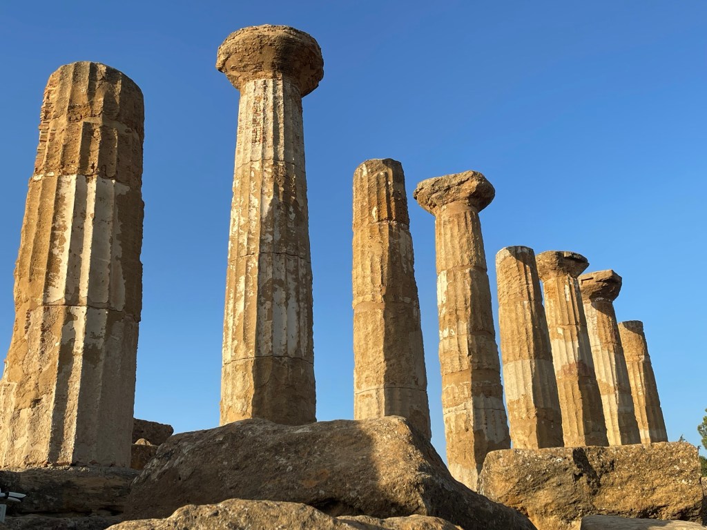 At 5pm, we were picked up from the marina office by our driver, Guiseppe and driven to Agrigento in his very nice, air conditioned, black van. The 40-minute drive took us through a few small towns but mostly farmland. Our first view of Agrigento was an ancient ruin on top of the hill. We were met at the entrance by a guide with an offer to give us a tour of the site. After some haggling, we settled on a price, paid the entry fee and walked to the first ruin. Anna, our guide, was very knowledgeable and we all agreed that it was worth the additional cost. The seven temples were built in 500BC during the Magna Graecia period and the area is one of the largest archaeological sites in the world. The surrounding land is fertile, with groves of almond and olive trees and has vast views across the Mediterranean Sea.