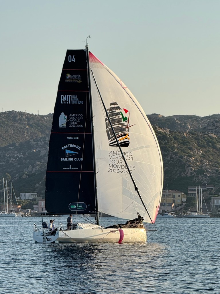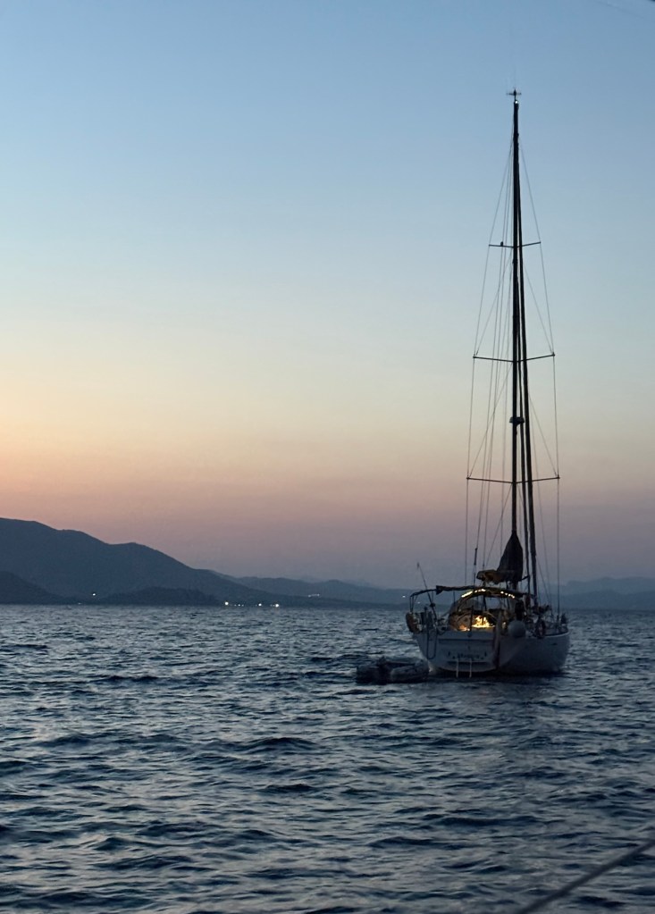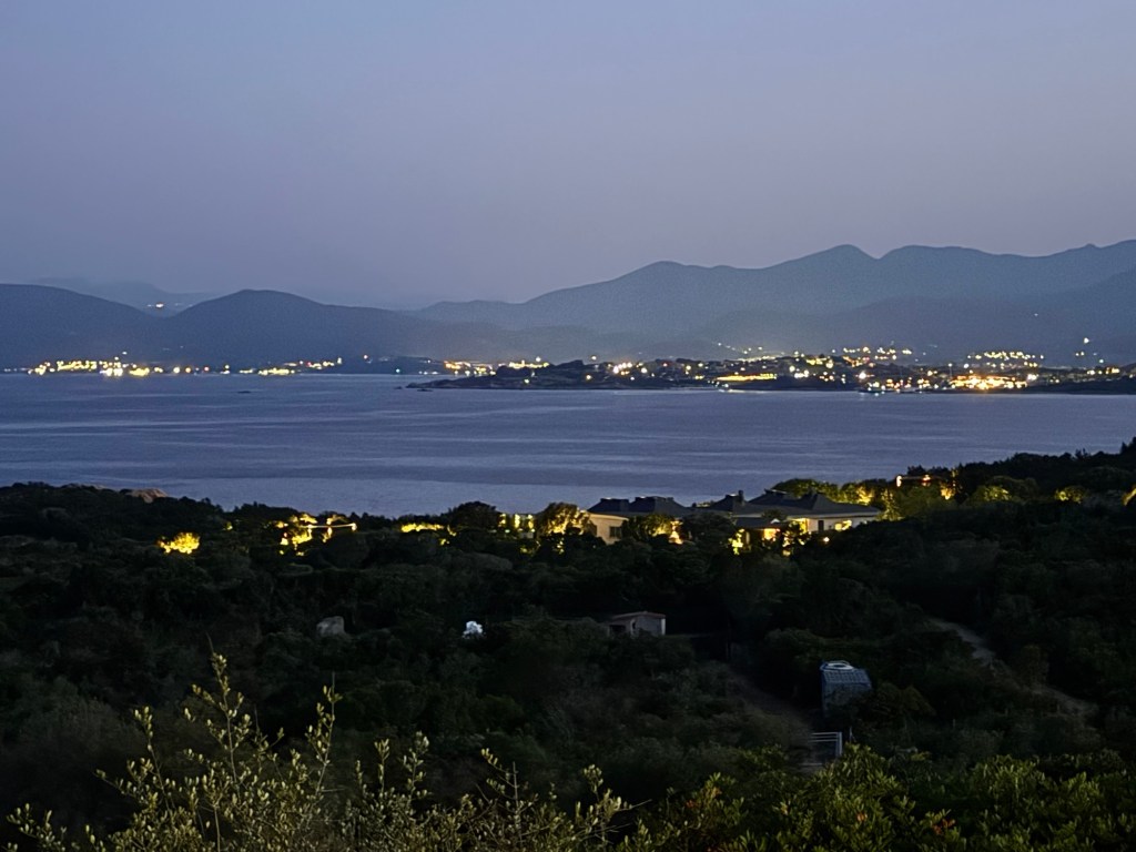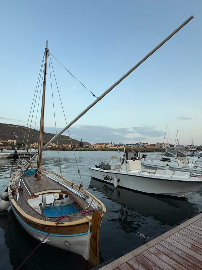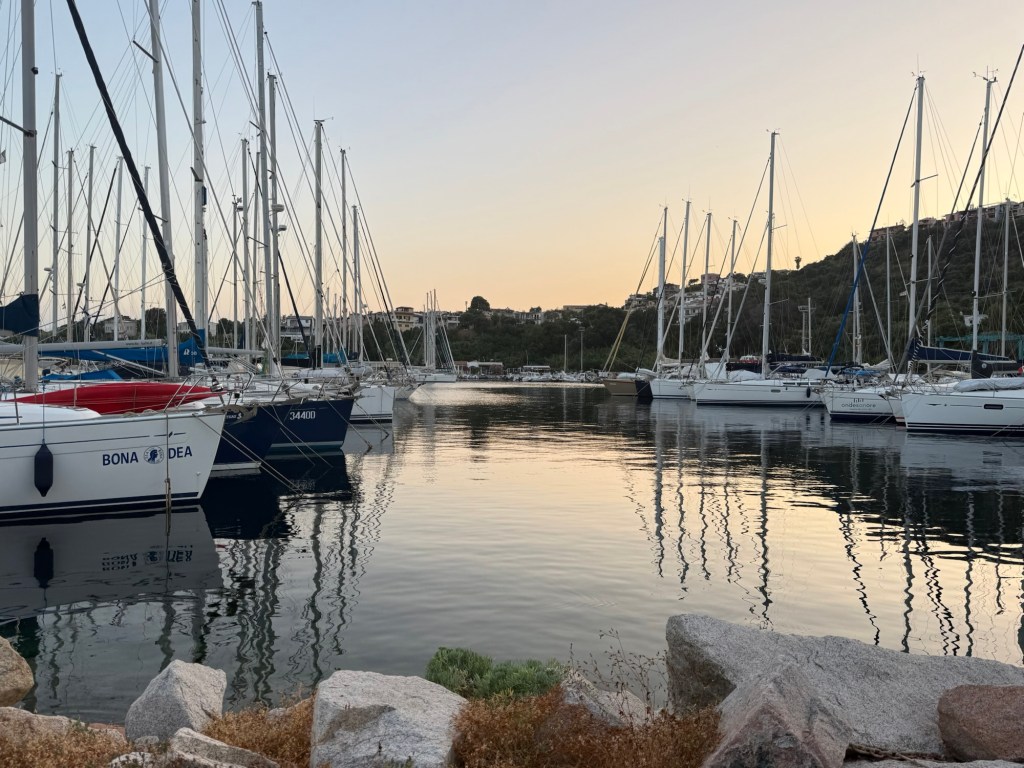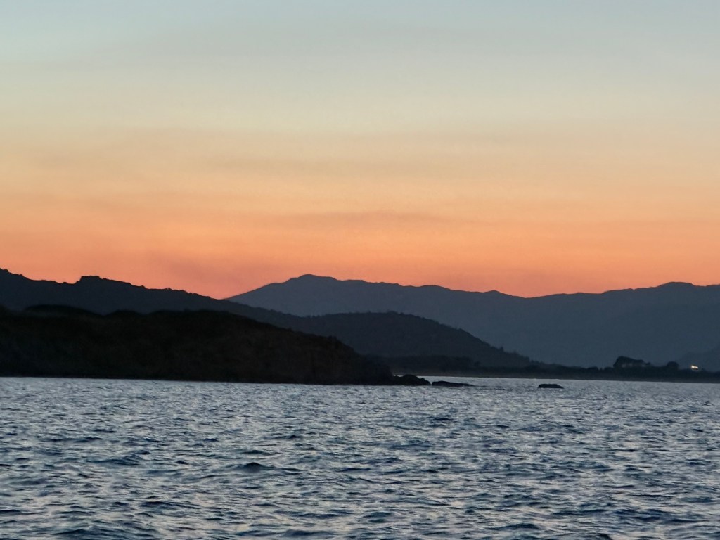 A long rough day of sailing took us to the north-west corner of Sardinia, where we anchored for the night. It was a beautiful and very popular location. The water was much calmer and we took the opportunity for a swim at dusk. It felt so special to be swimming under the stars with the lights on shore twinkling in the distance.