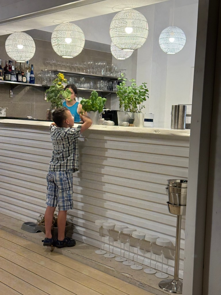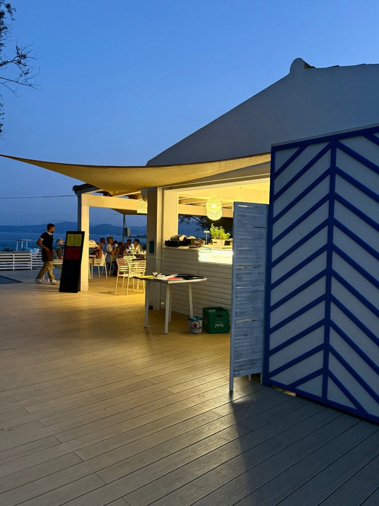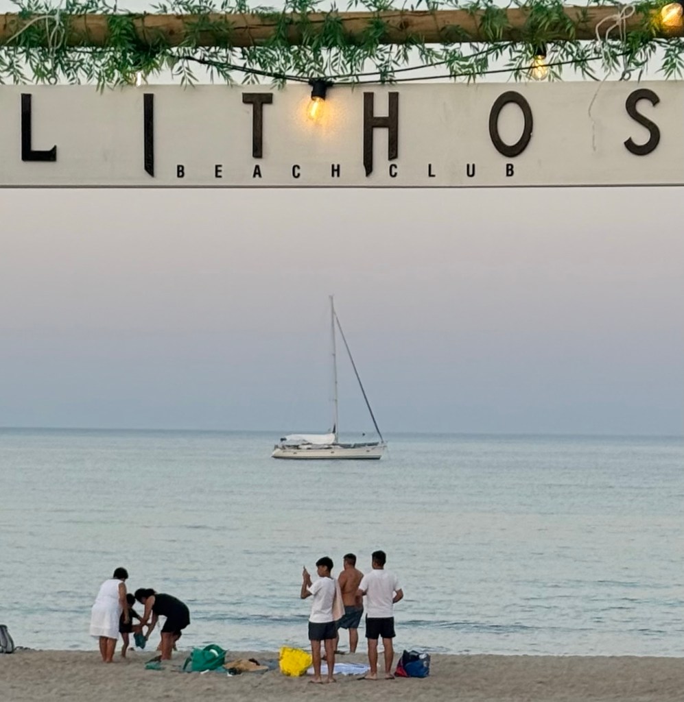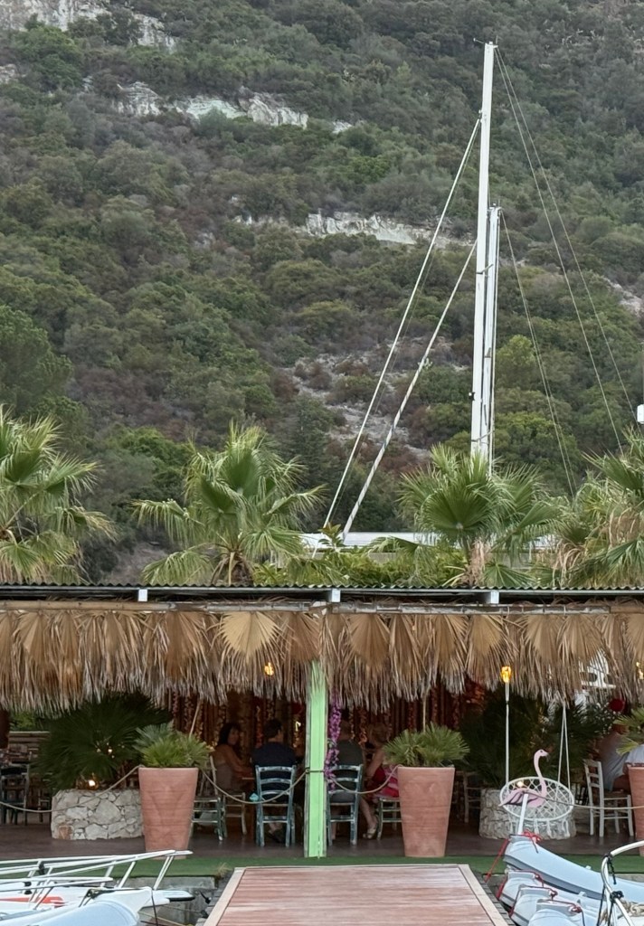 After a few more nights back on anchor, we arrived at the Pontile Salina Bamba, a small pontoon marine adjacent to a sandy beach filled with tourists staying at the holiday resorts in the hills behind. We found a restaurant a half hour walk away and later that evening trekked up the hill for dinner. It was a hot and frustrating walk as Google maps had given us very strange directions, but we did see some amazing homes with large, beautifully manicured gardens. Eventually we found the restaurant and were rewarded with a stunning view across the bay. The food was great, but unfortunately the local European wasps also thought so, making it very difficult for a few of our group to enjoy their dinner.
