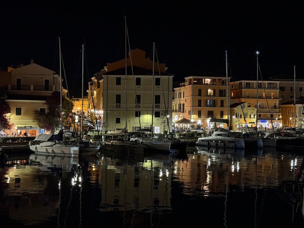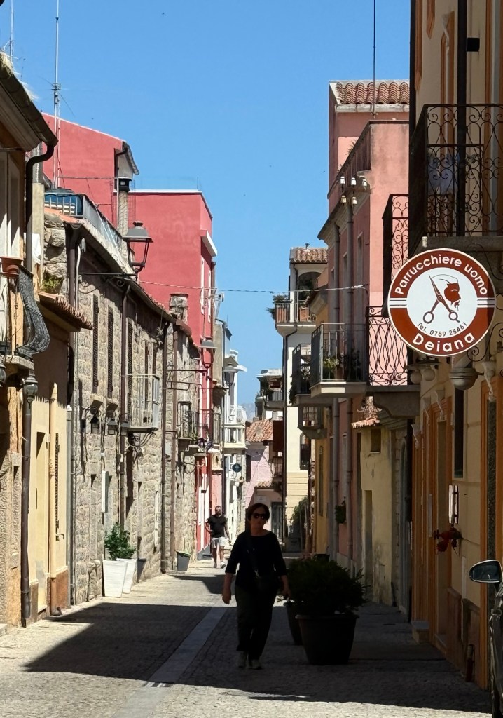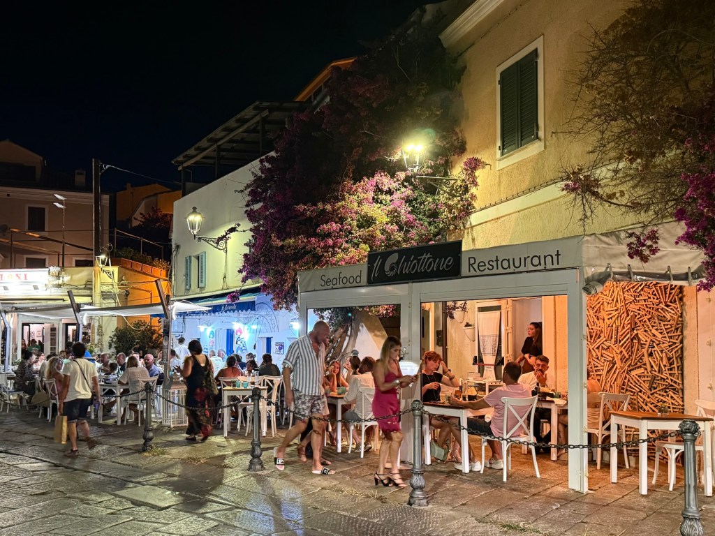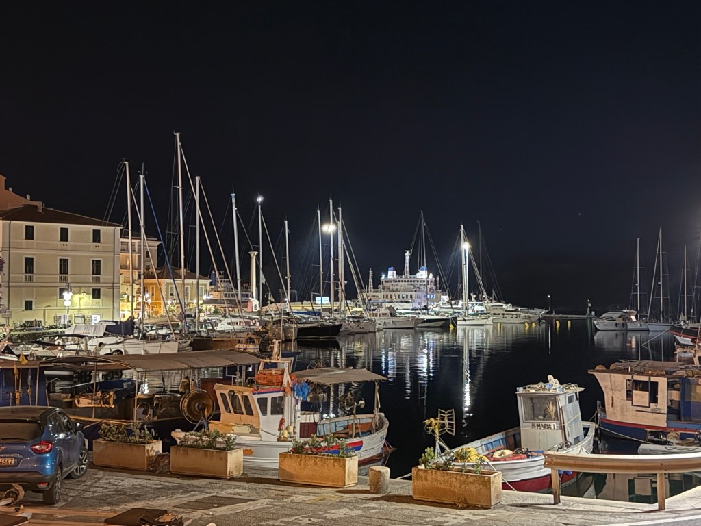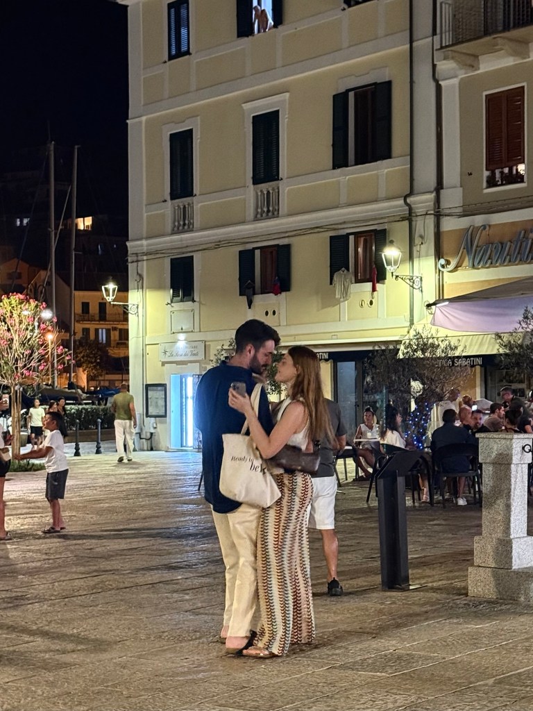 Our marina at La Maddelana on the island of the same name, was very close to the centre of town. The waterfront is lined with bars and restaurants. The street behind, with more restaurants and shops, winds around to a large piazza. We spent the afternoon wandering in and out of shops and I made a much-needed hair appointment for the next day. After dinner that night we walked through the town and further along the waterfront. It was a beautiful night and every bar and restaurant was filled with people eating, chatting and laughing. La Maddelana felt like such a happy town!