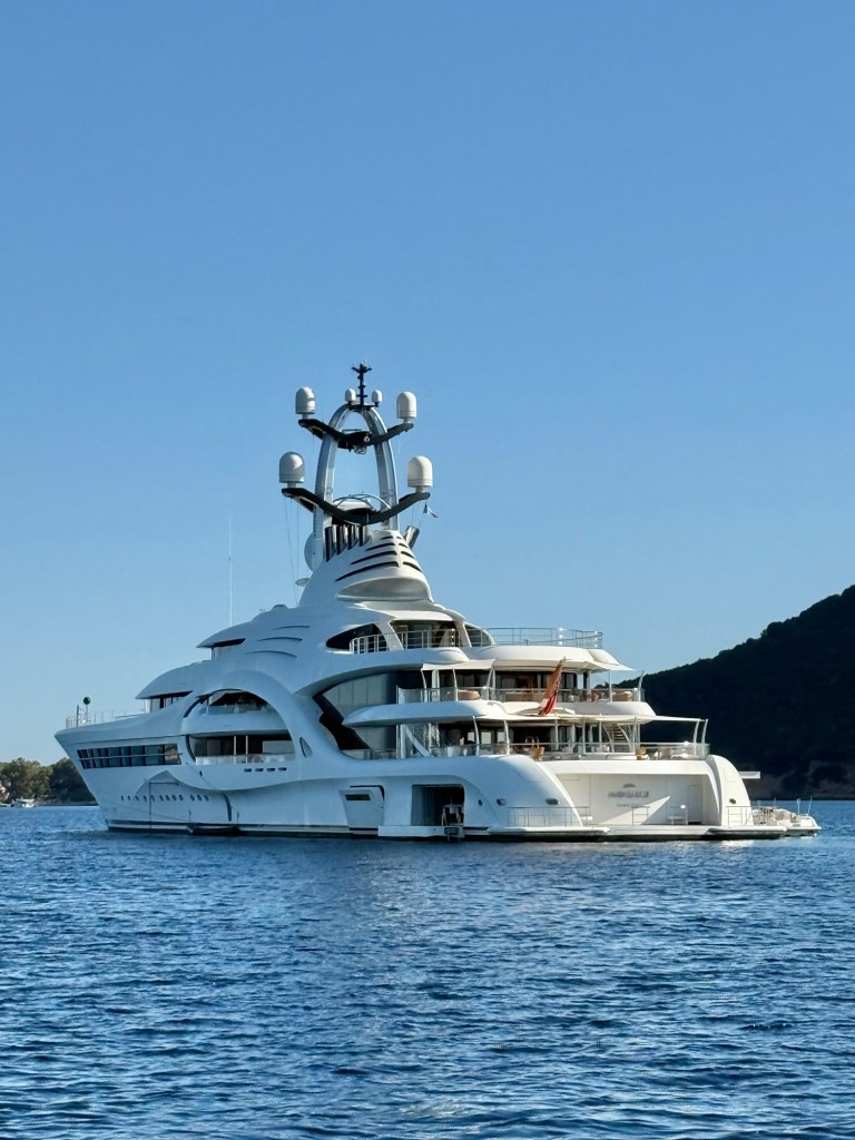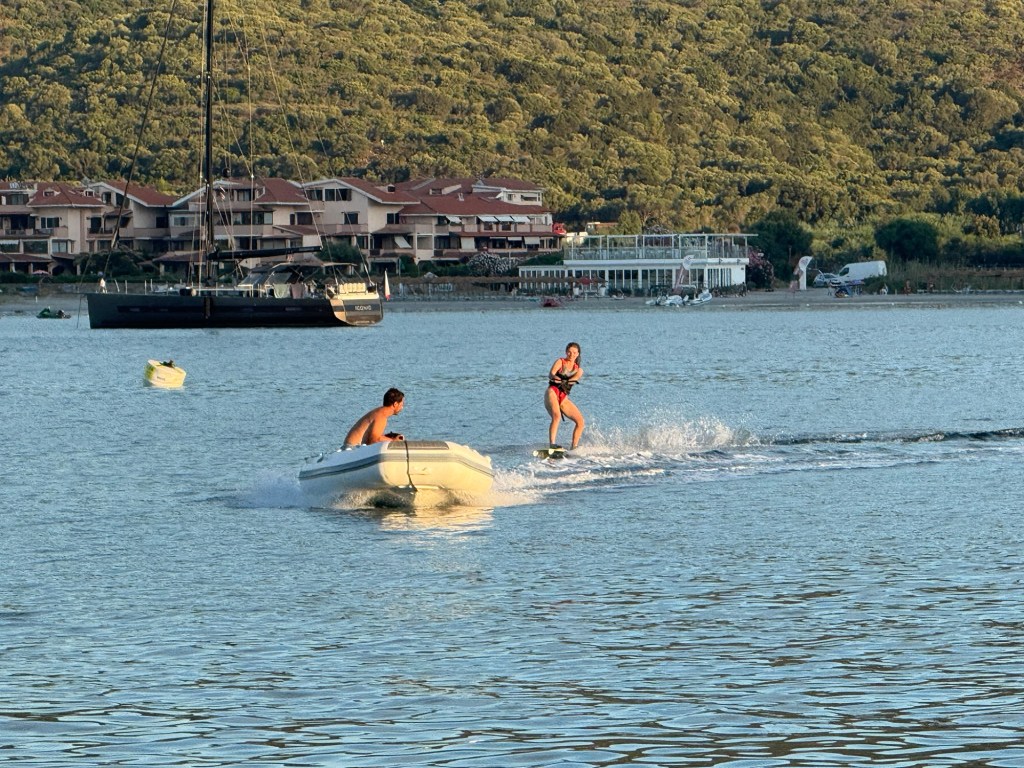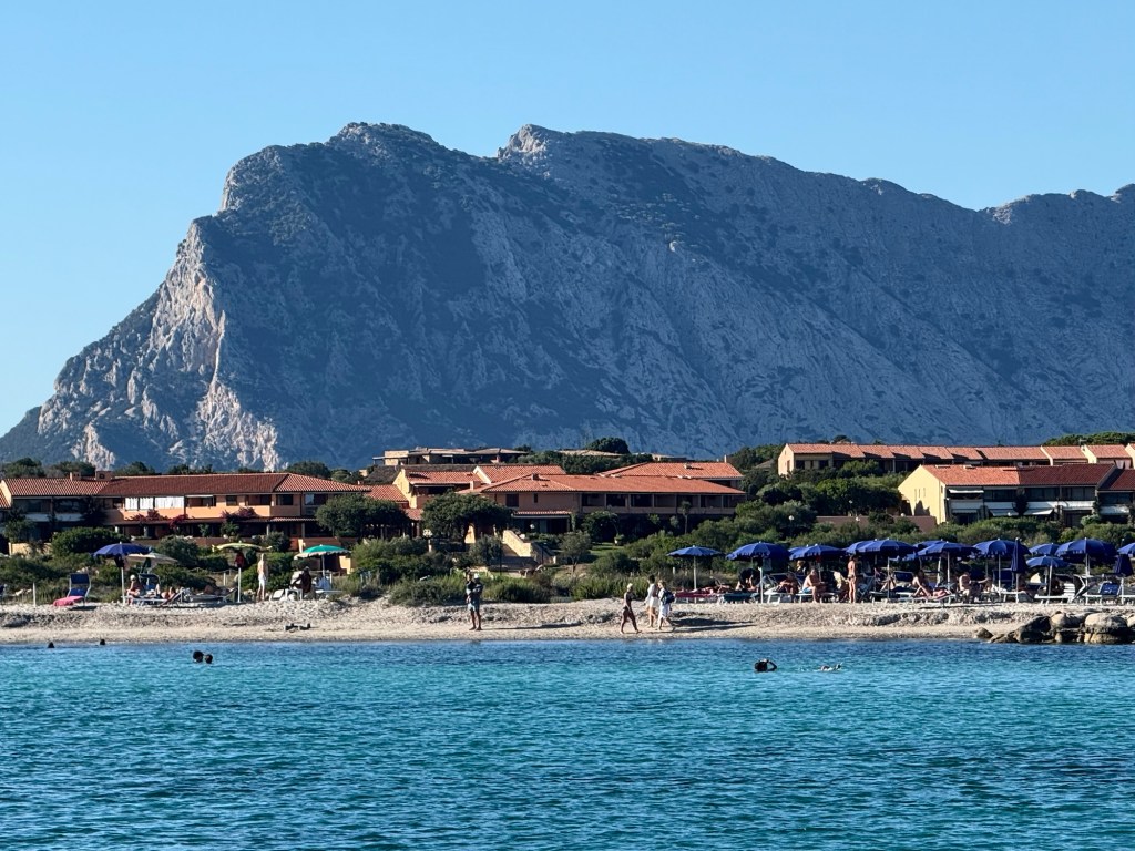 Over the next few days we bay-hopped up the east coast, sometimes taking 6 or 7 hours to reach our destination. The coastline has stunning views of craggy rock mountains and long sandy beaches but there are very few places where you can take a dinghy to shore for dinner. At Capo Carbonara under the watchful light of its beautiful lighthouse, we ate on the boat … delicious pasta carbonara cooked by Sally. The next stop was Cala Sa Figu where we anchored alongside massive yachts and cruise boats. Cala Foxi Manna was our fourth anchorage and we were able to take the dinghy to shore for dinner at the Lithos Beach Club. The bay had beautiful clear water and stunning views and was an ideal place to swim off the back of the boat and paddle the kayak, especially as the temperature and humidity levels were rising rapidly.