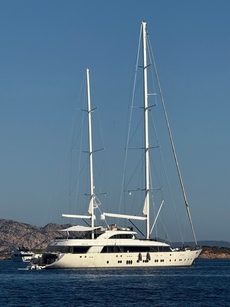 The following morning we sailed to nearby Capo Camino for a swim near the magnificent Tavolara Island. The island is 5km wide and 1km long and is made up of limestone mountains. It’s a popular spot for sailors and scuba divers and we were surrounded by some very large and unique sailing and power boats, including an old square rigger.