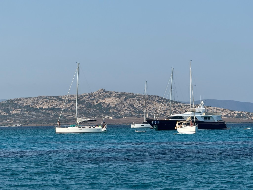 The Maddelana Archipelago is a group of seven islands located between Sardinia and Corsica, and as a national park has strict rules to protect its wildlife and sea grasses. We’d read about Cala Cotticio, also known as Tahiti Beach on the island of Caprera, and decided to check it out on the way to our marina at La Maddelana. The area was packed with small motorboats filled with families out for a day of fun on the water. Larger yachts like ours are required to anchor at least 300m from the beach, so I took the kayak for a paddle to get a better look at the beach. It was very pretty, but I’m still unsure why it’s been named one of the world’s best beaches.