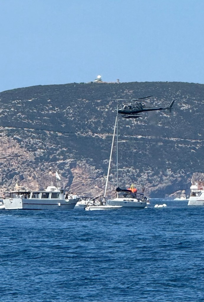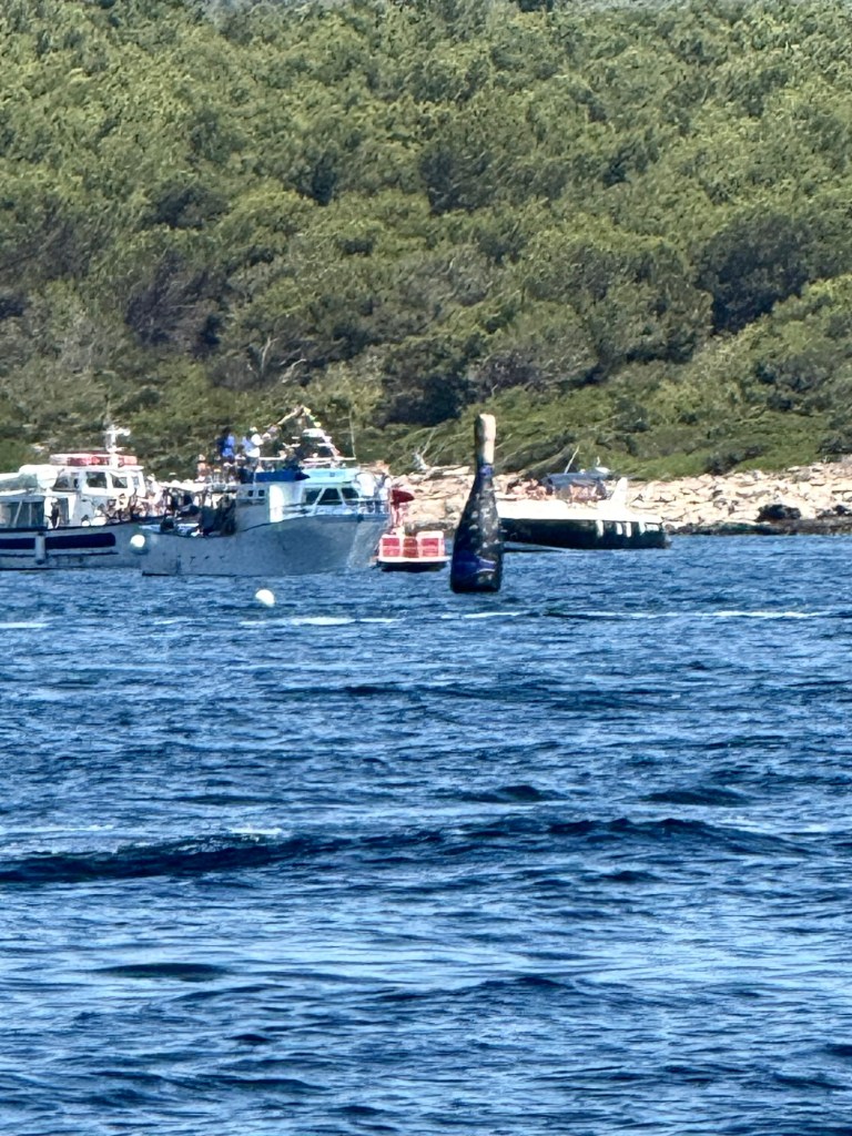 Our final anchorage was in a large bay adjacent to Porto Conte and a short sail from Alghero. As we motored towards it, we saw many small motorboats heading in the same direction. We then spotted a black helicopter circling above us before lifting a large crate from the water. There appeared to be a giant wine bottle sitting on the water. A quick online search revealed that it was Akenta Day, when sparkling wine that has been aged for months on the seabed, is lifted from the water. There were many boats surrounding the site and guests celebrate with lunch, music and a toast with Akenta wine. This year for the first time, there was an evening parade through the old town. We were sorry to be missing it but we didn’t have time to backtrack.