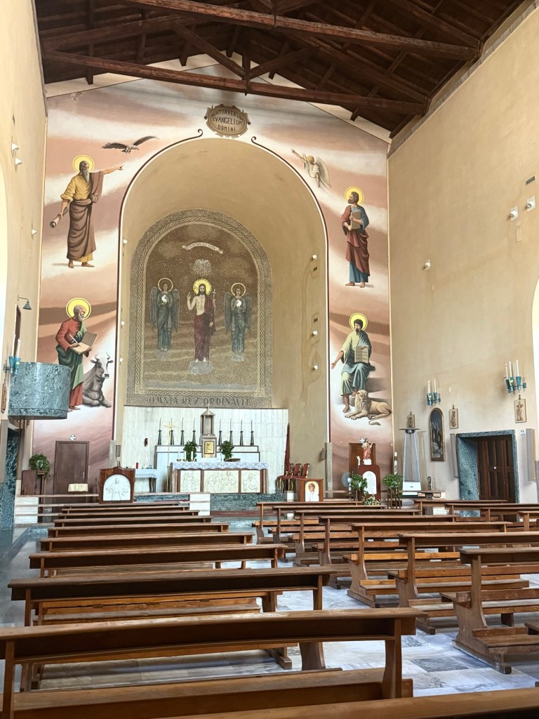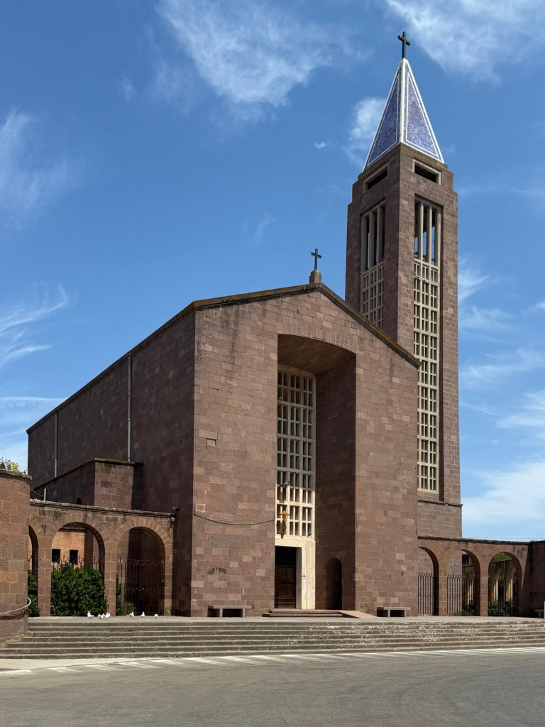 The town has only a small supermarket, pharmacy and bank, but no less than six café/restaurants, all near-full for lunch and dinner each day. We wondered how such a small town could support so many restaurants as there didn’t appear to be many tourists. Fertilia was built in the 1930’s and settled by immigrants from north east Italy as well as Istrian and Dalmatian exiles following the Second World War. It has some interesting buildings from that period including the church and an art deco school. The church has a beautiful design on the high altar, made in 1939 by a well known Sardinian artist.